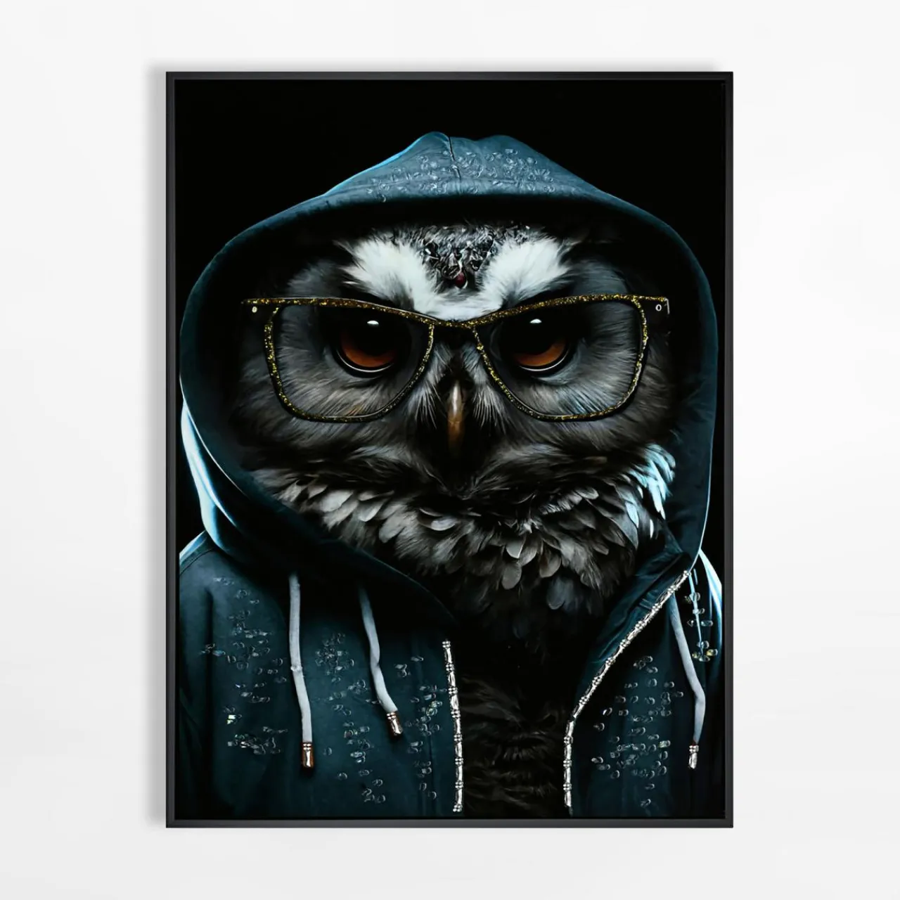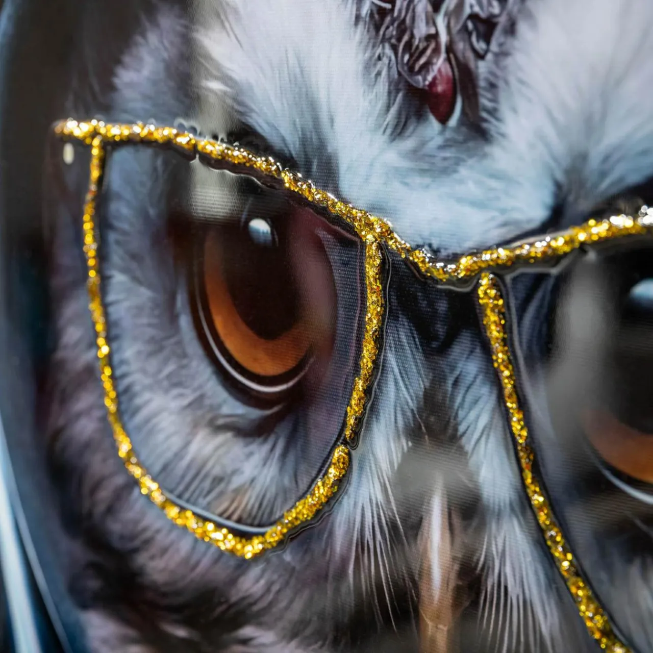 Obraz na płótnie z grafiką sowy w kapturze trafi w gust miłośników natury oraz sztuki współczesnej. Ma naklejone ozdoby z akrylu, dzięki którym lekko się mieni.