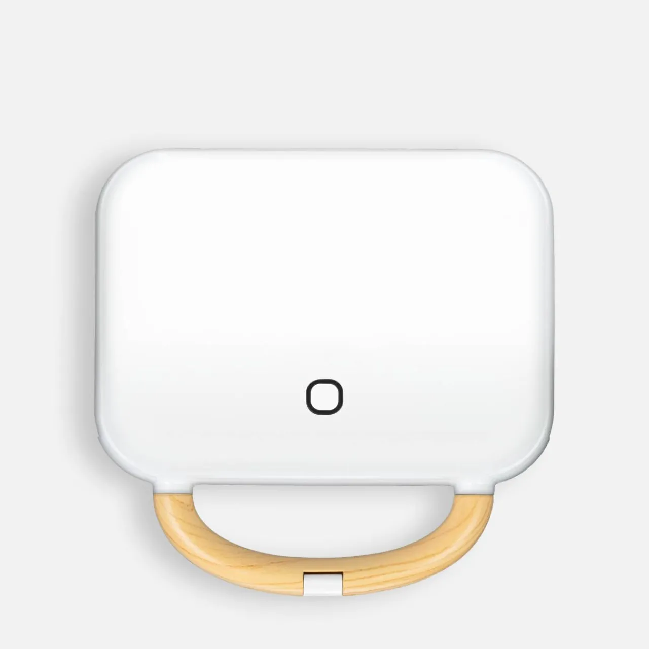 Model opiekacza MOP-51/B1 został wykończony w białym, matowym kolorze z uchwytem ozdobionym o wybarwieniu jasnego drewna.