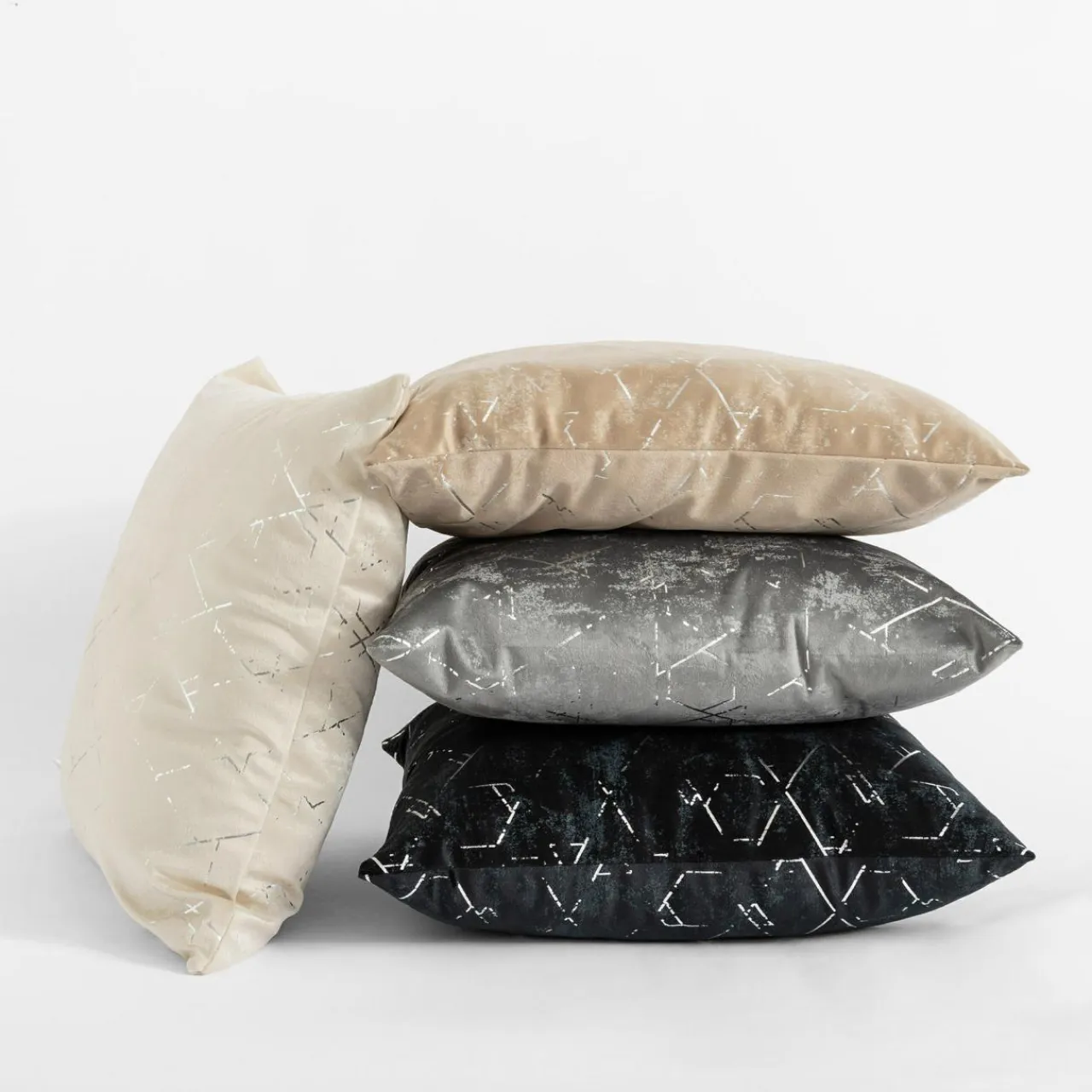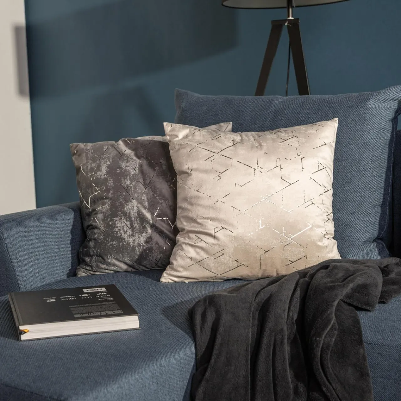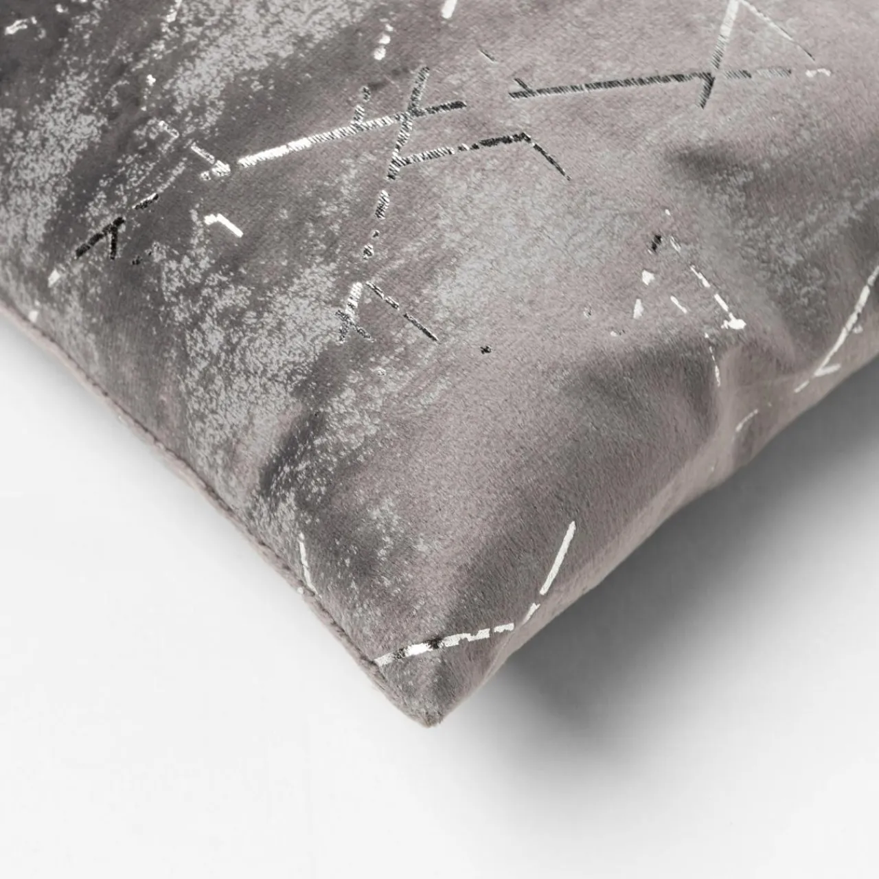Szara poduszka z kolekcji NORAH ze srebrnym, połyskującym wzorem doda wnętrzu elegancji oraz blasku.