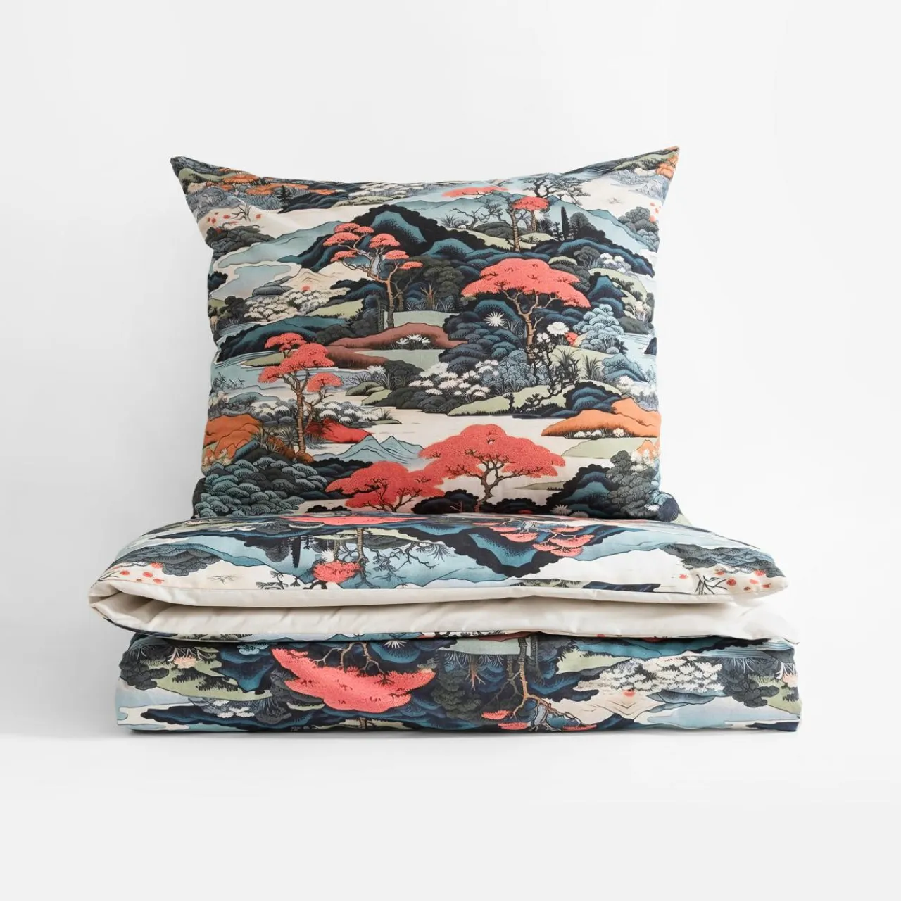 Kolorowy motyw z orientalnym pejzażem wizualnie ożywi wnętrze klimatycznej sypialni.