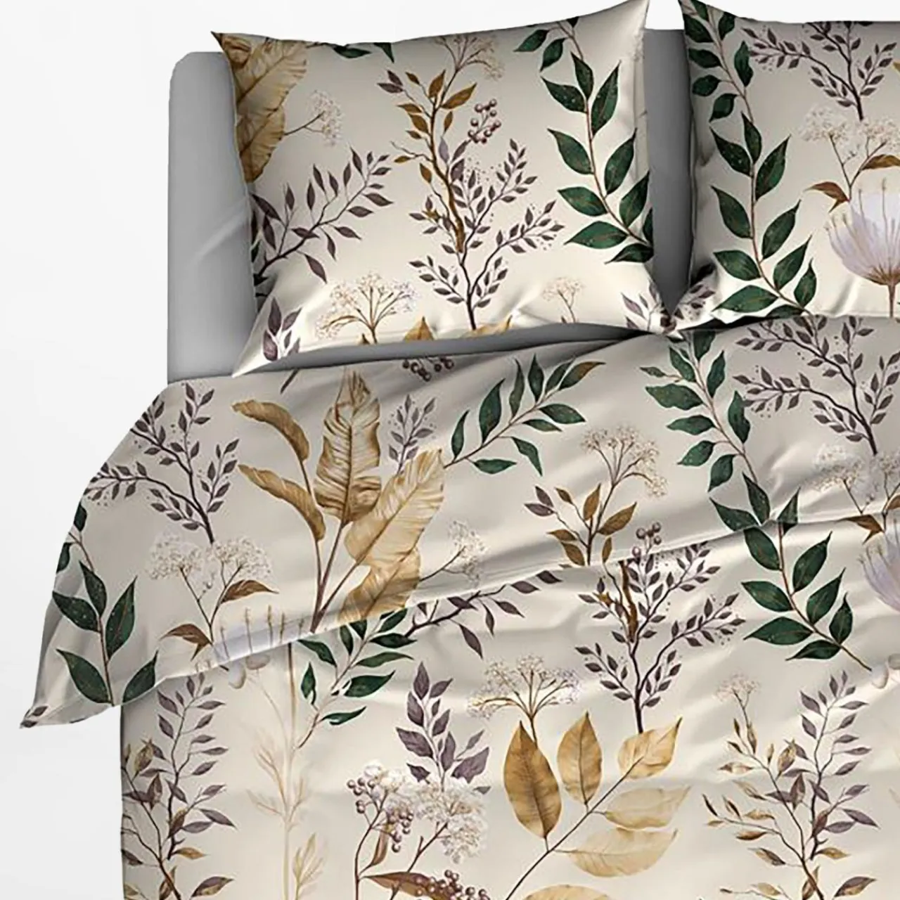 Beżowa pościel z motywem polany doda aranżacji przytulnego akcentu. Pomoże podkreślić ciepłą, relaksującą przestrzeń.