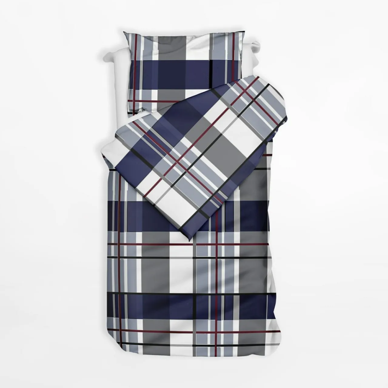 Granatowa pościel w kratkę pomoże odświeżyć aranżację i doda sypialni przytulnego akcentu.