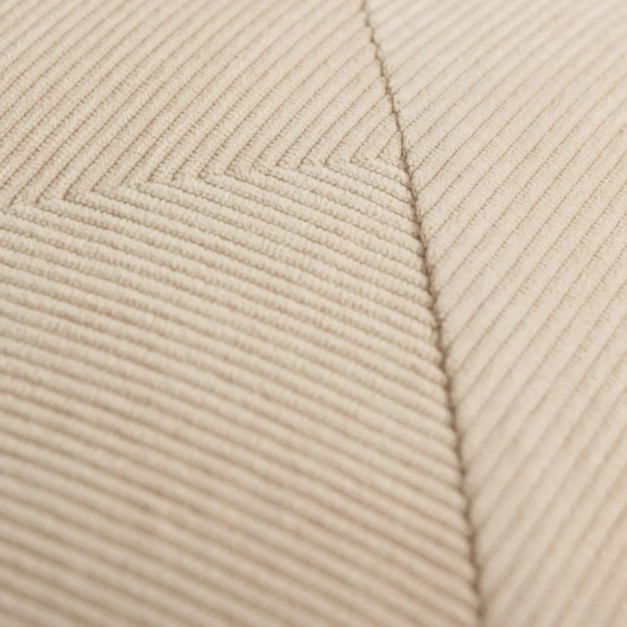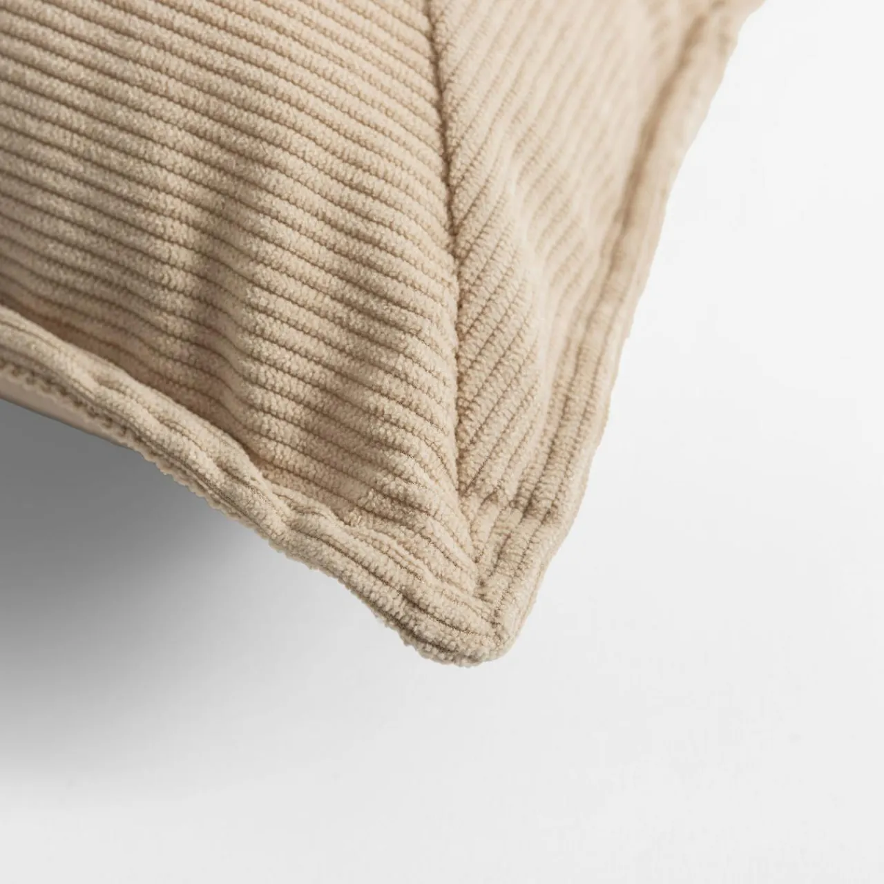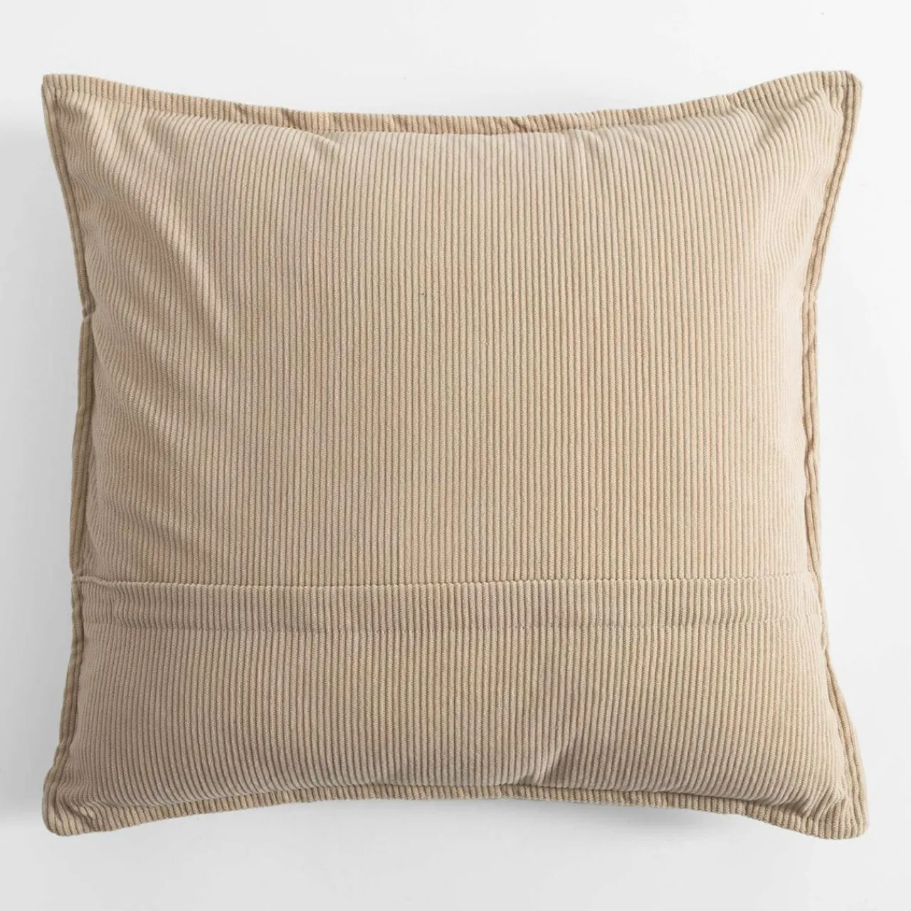 Beżowa poszewka IRENE z miękkiego materiału pasuje do drewnianych i brązowych mebli.