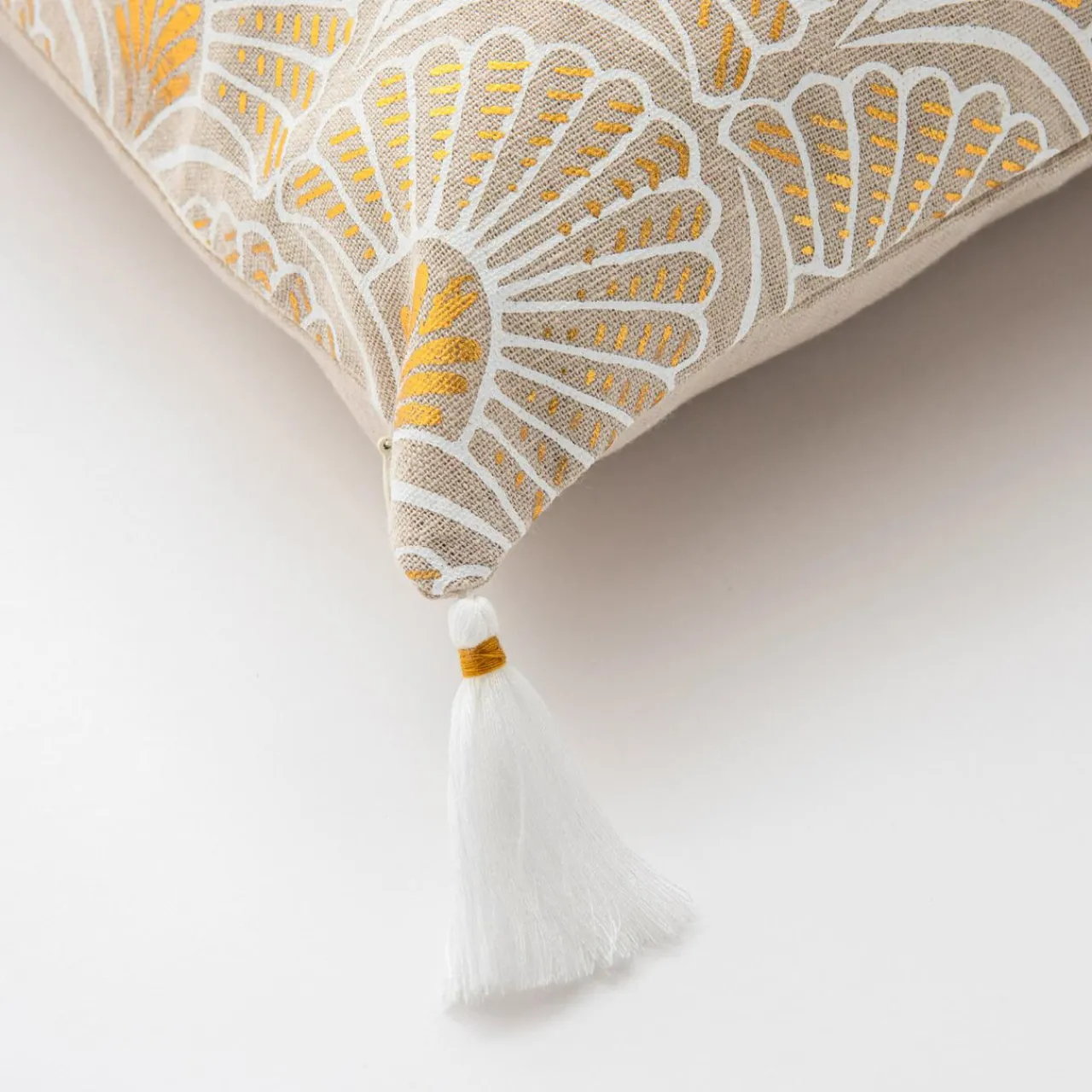 - 4 białe chwosty są zdobione złotymi nitkami – razem z połyskliwym wzorem na poszewce tworzą spójną kompozycję i ożywią wnętrze.