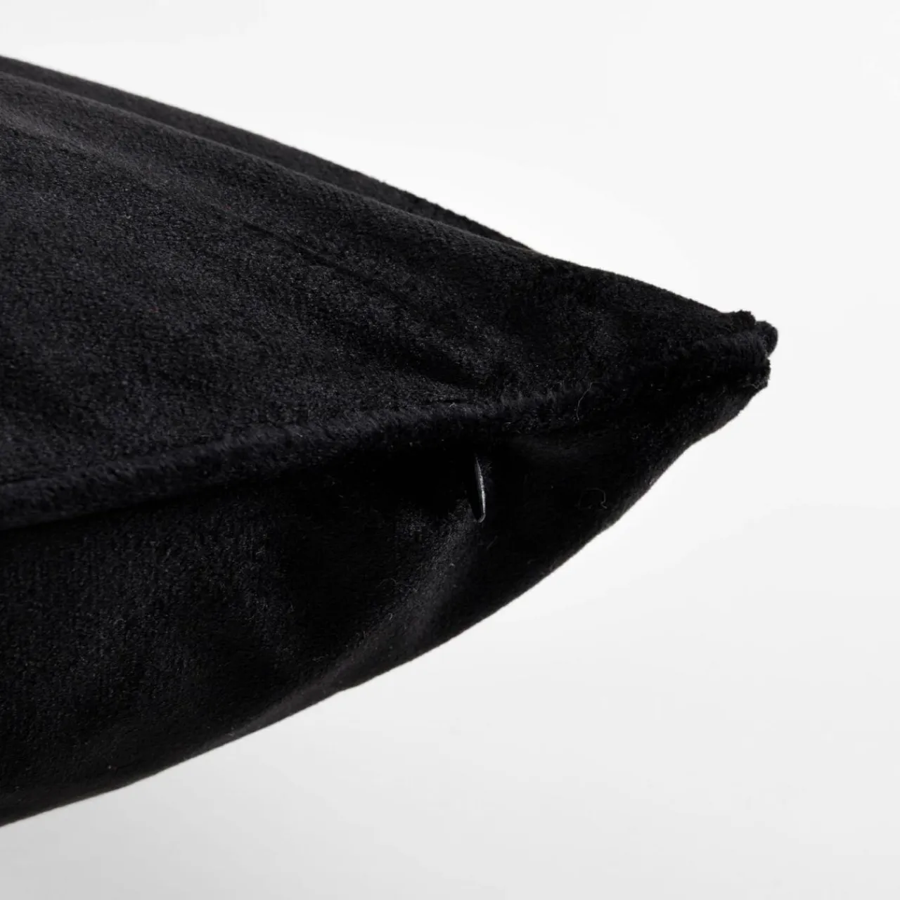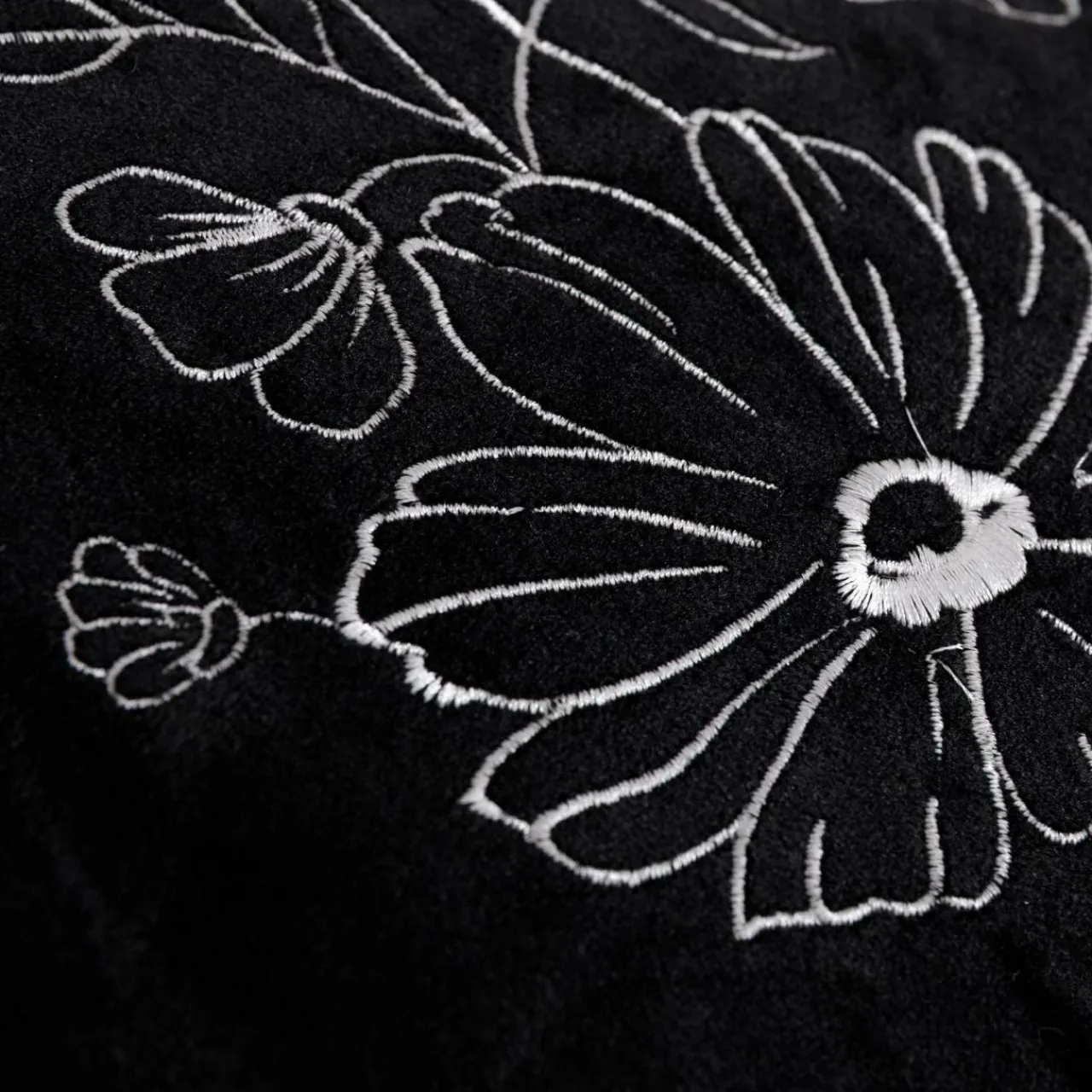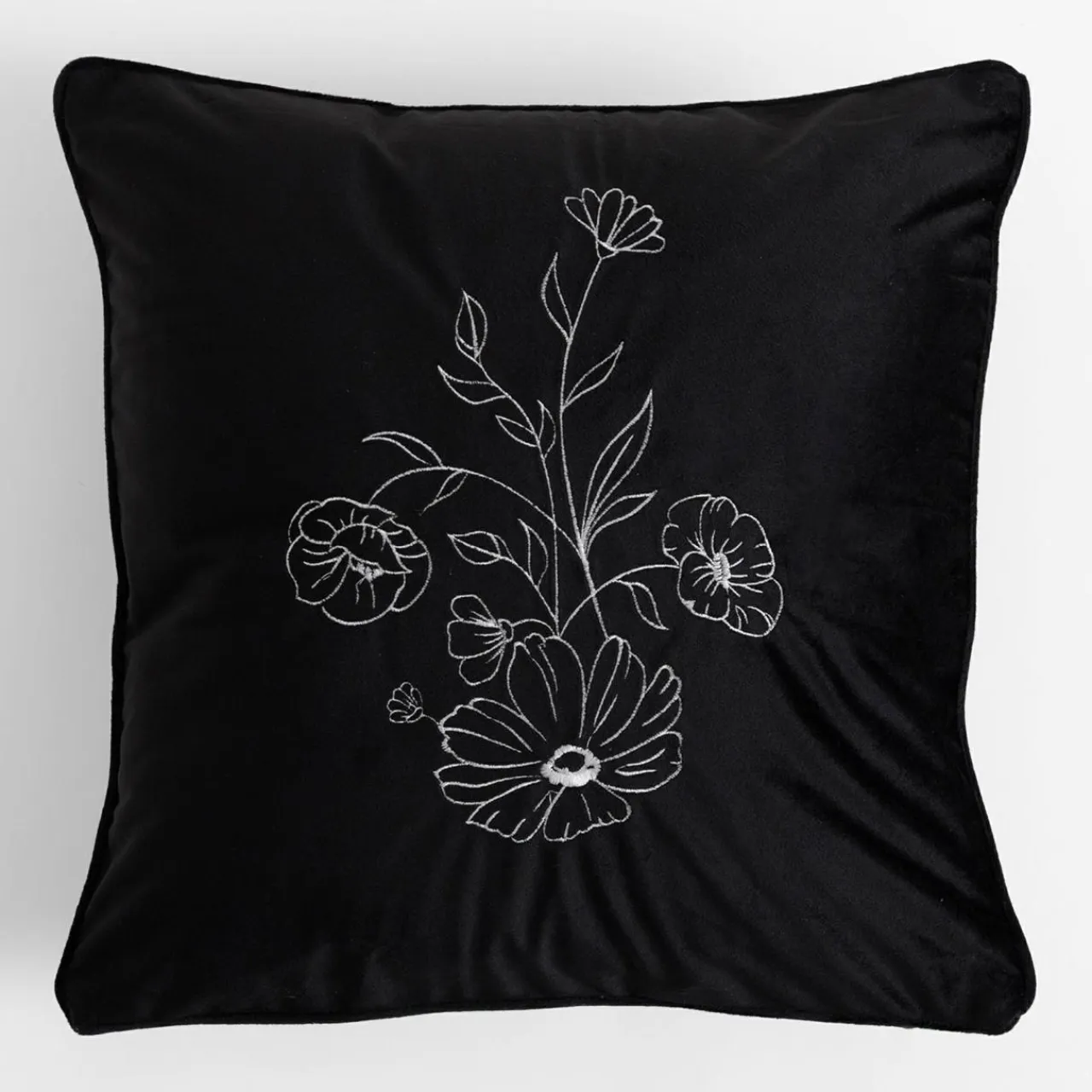 Czarna poszewka PERLA jest miękka oraz gładka w dotyku. Ma biały, haftowany wzór.
