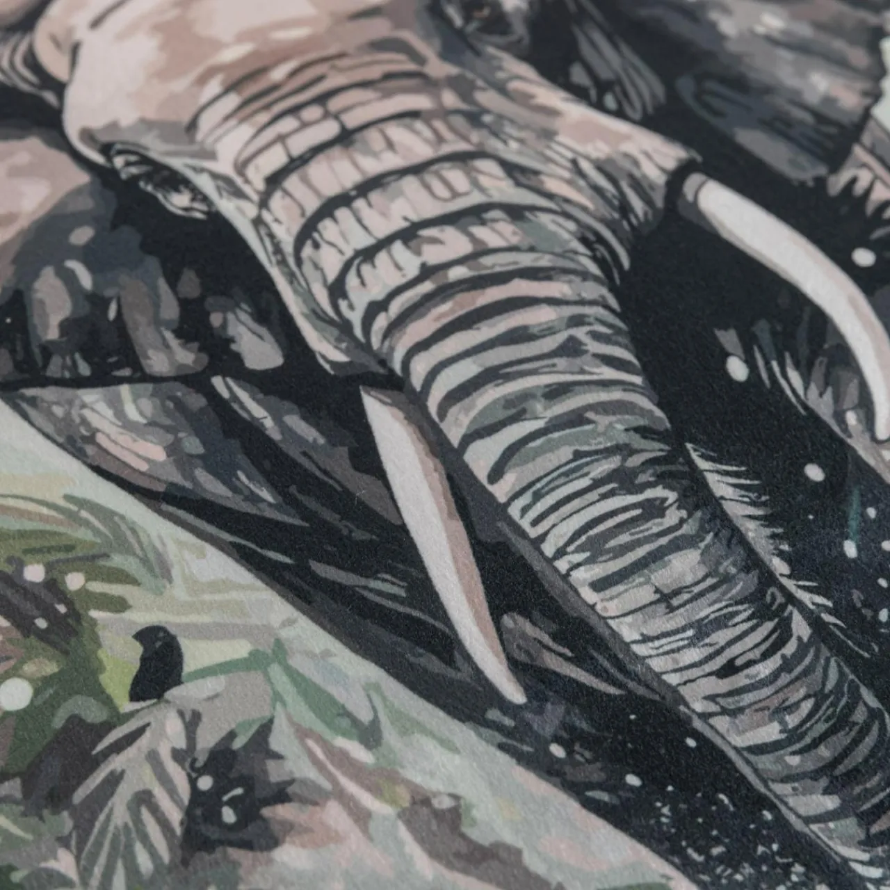 - Poliestrowa tkanina ma wyższą odporność na ścieranie – kolorowy wzór słonia na długo ozdobi nowoczesną aranżację salonu lub sypialni.