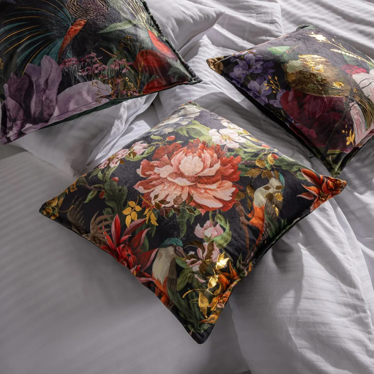 - Kwitnące pąki kwiatów na ciemnej poszewce ROSARIO przykują uwagę gości.
