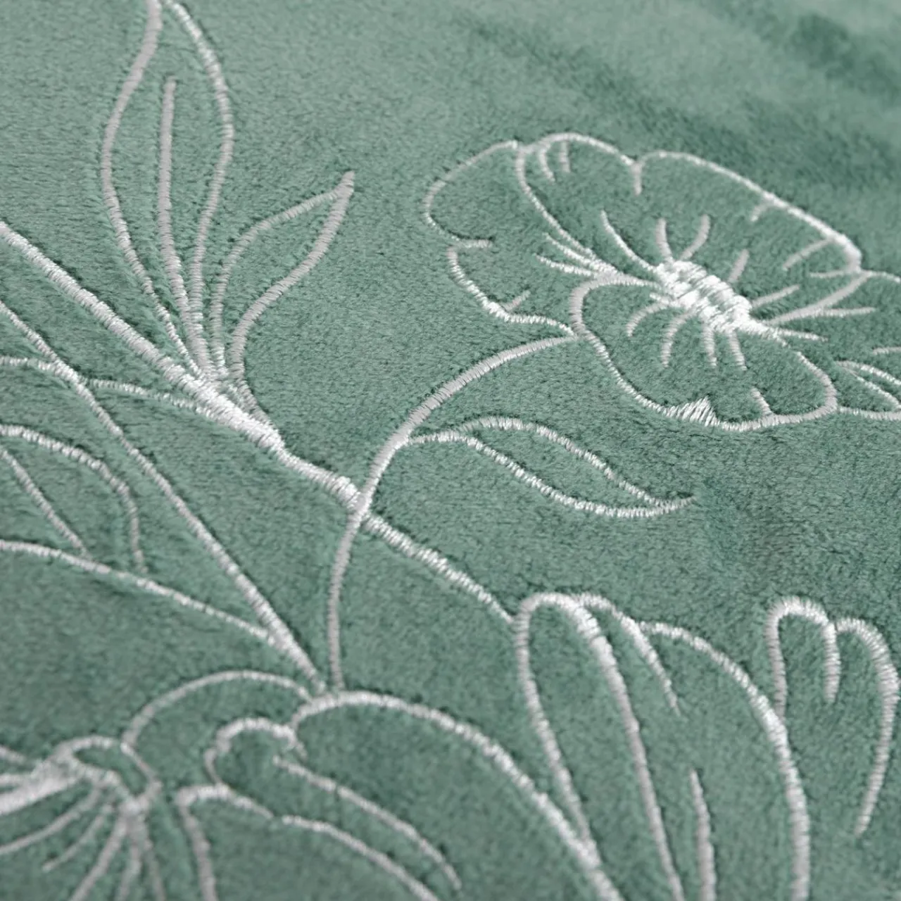 Zielona poszewka PERLA jest miękka i gładka w dotyku. Wyróżnia się białym, haftowanym wzorem.