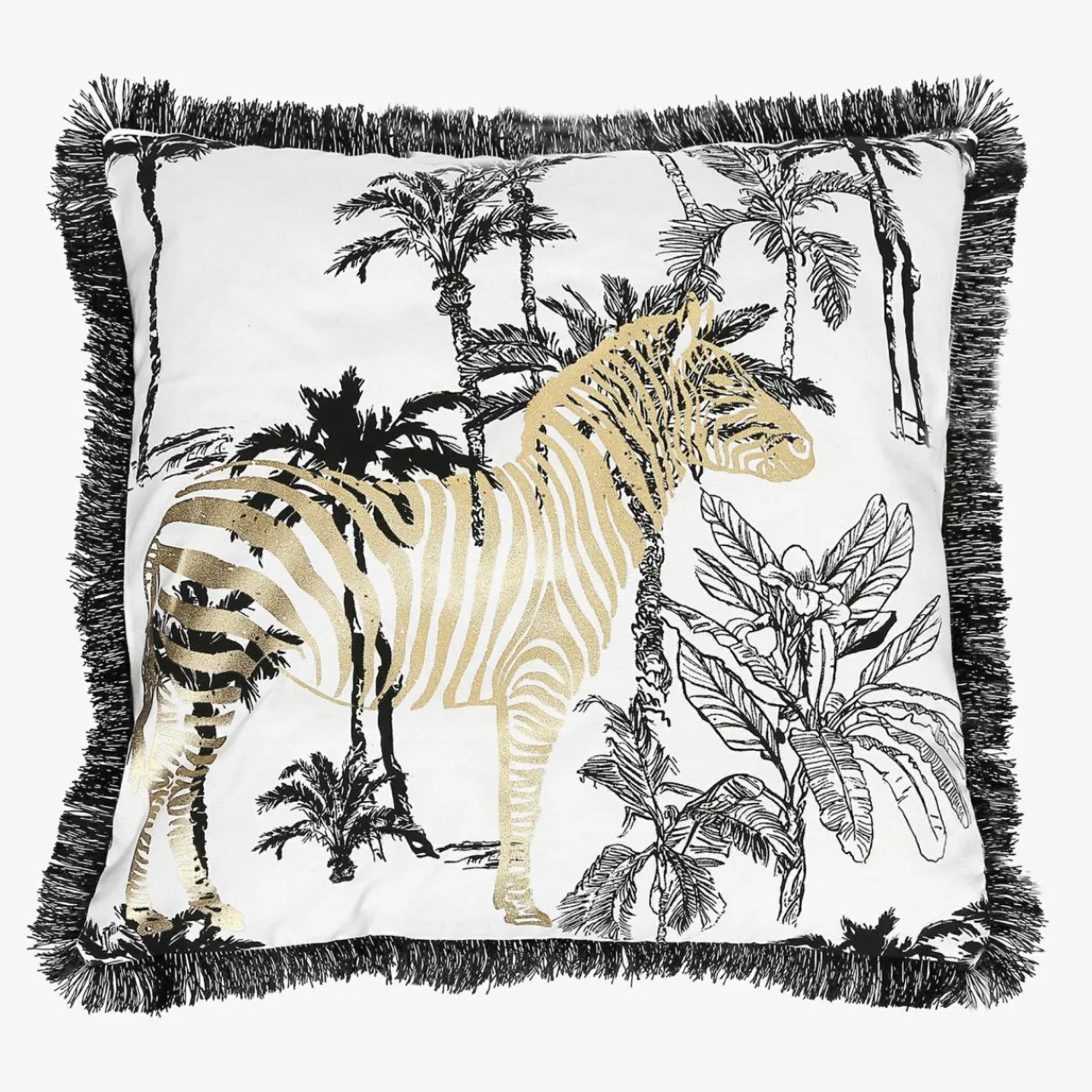 Salon glamour zyska blask i elegancję dzięki białej poszewce z czarnymi frędzlami z kolekcji SIRE – złota zebra przykuje uwagę, a gładka tkanina o płóciennym splocie sprawi, że aranżacja zyska wyjątkowy klimat.