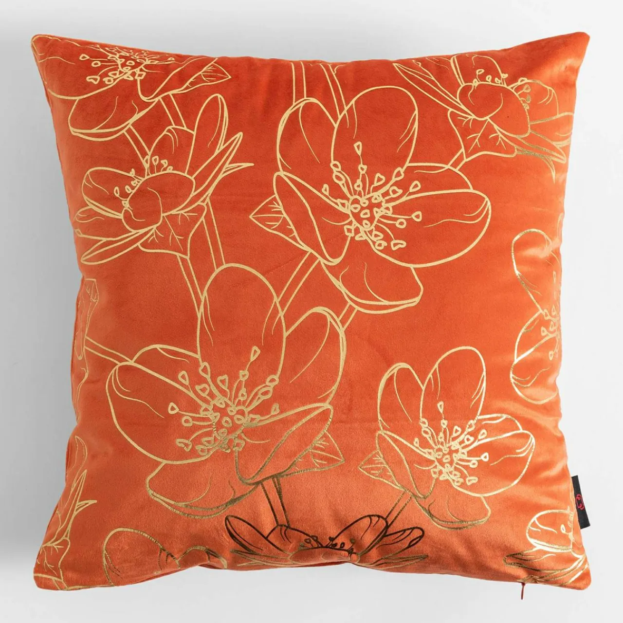 Pomarańczowa poszewka CASILA przykuje Twoją uwagę złotym, kwiatowym wzorem.