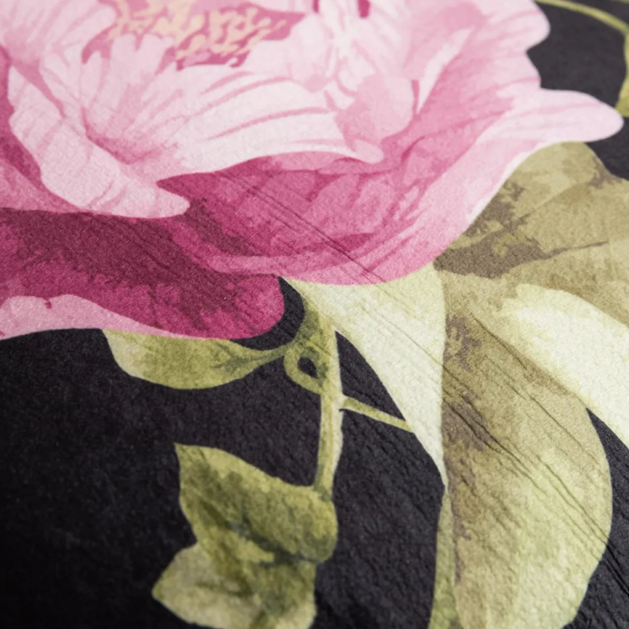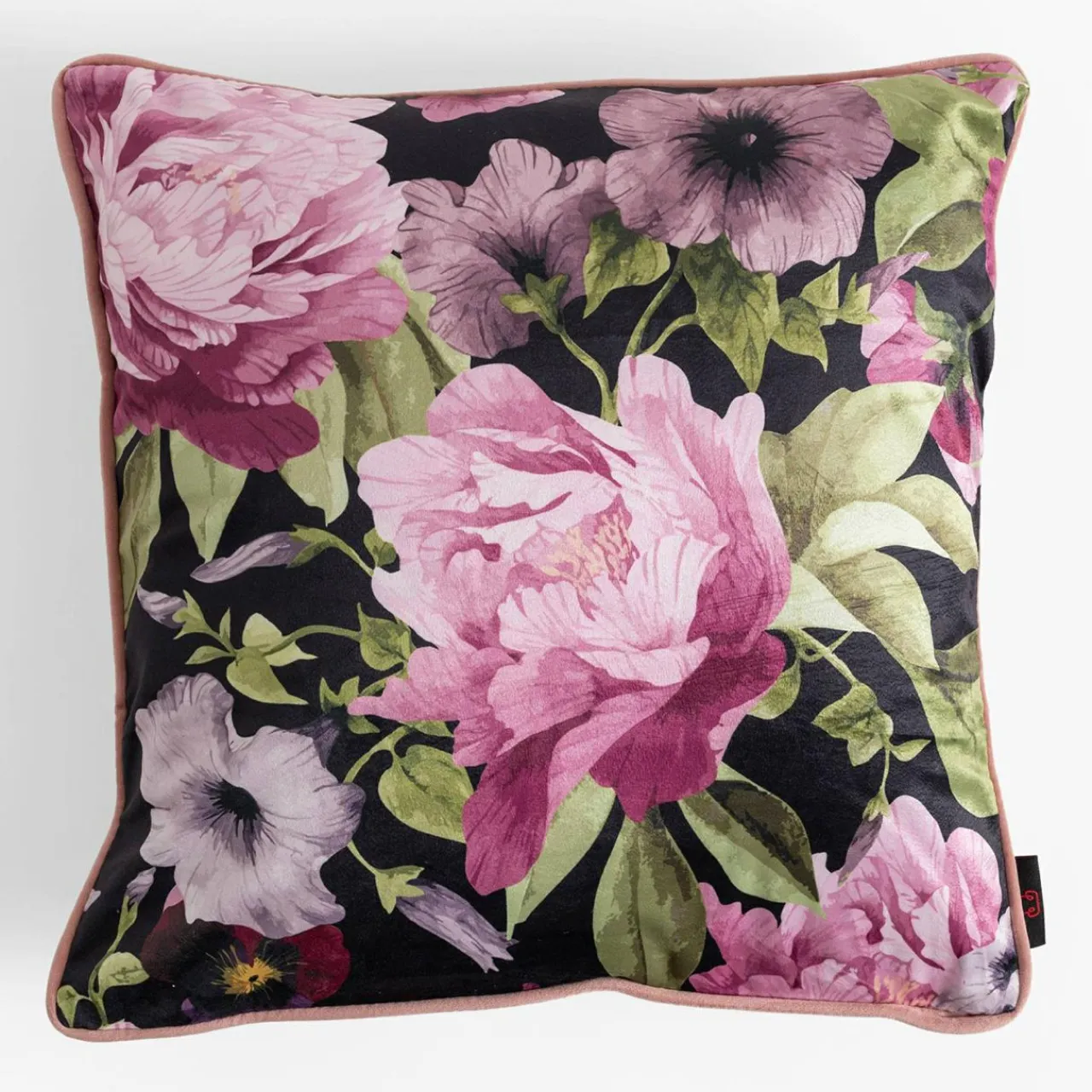 Dekoracyjna poszewka COLINA o czarno-różowym kolorze z roślinnym motywem róż i petunii podkreśli wnętrze w stylu romantycznym.