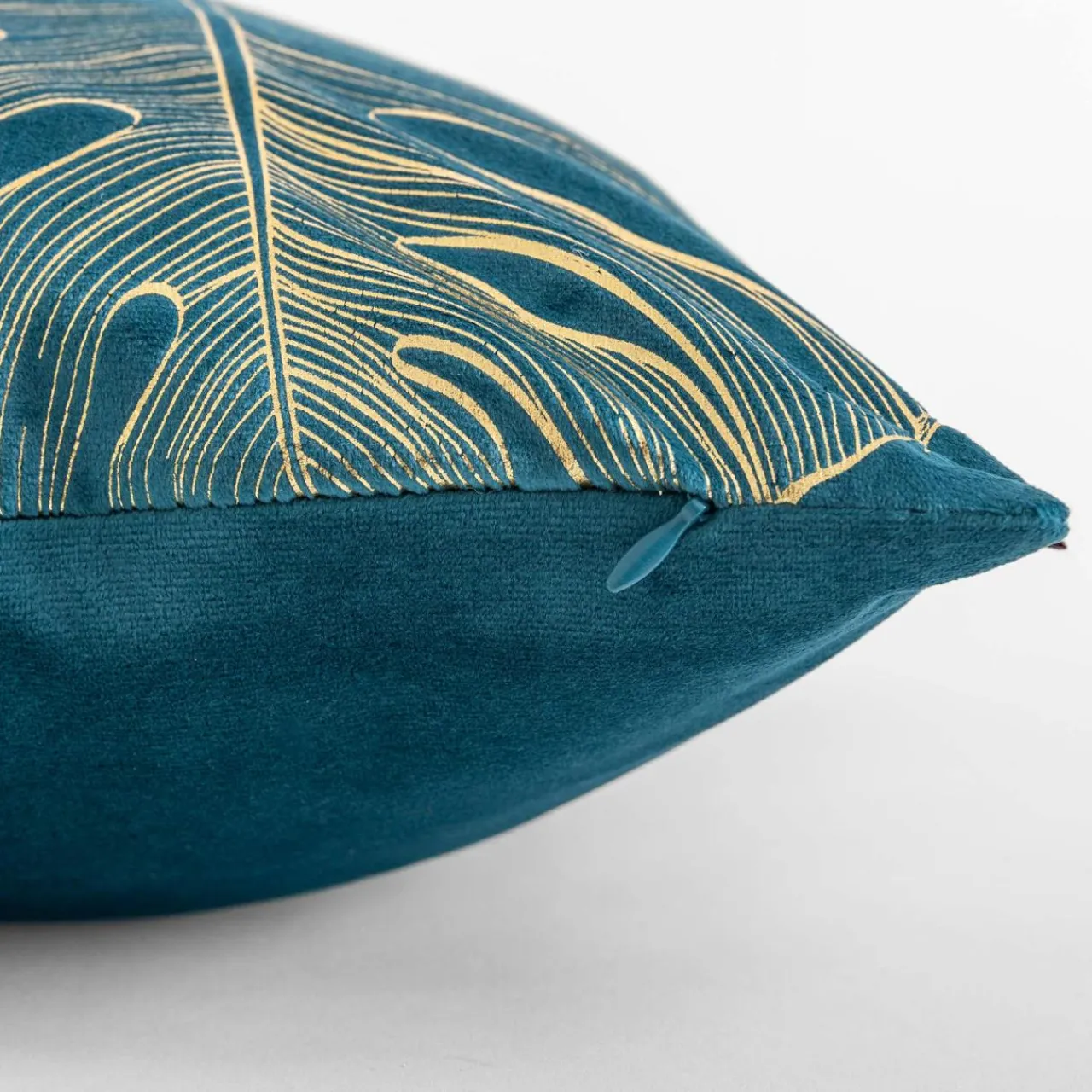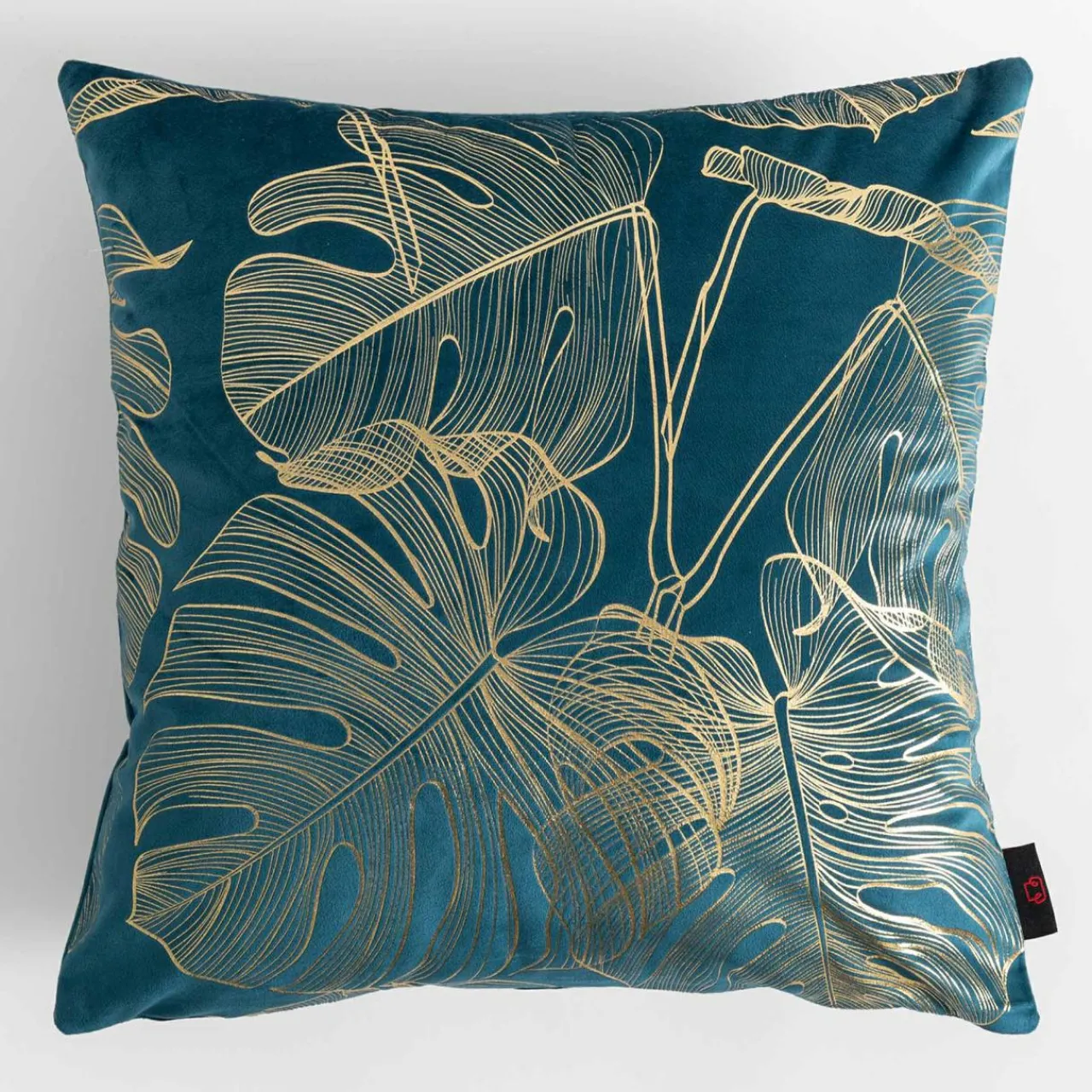 Dekoracyjna turkusowa poszewka AMBRO w monstery podkreśli barwny wystrój salon lub sypialni.