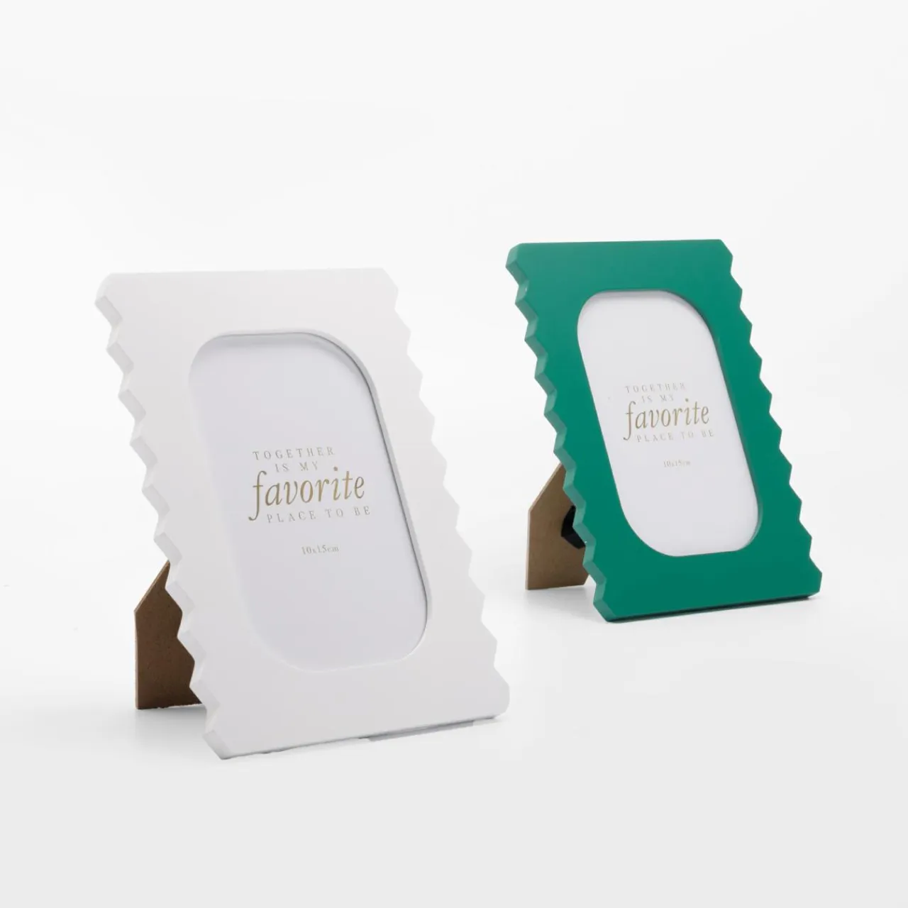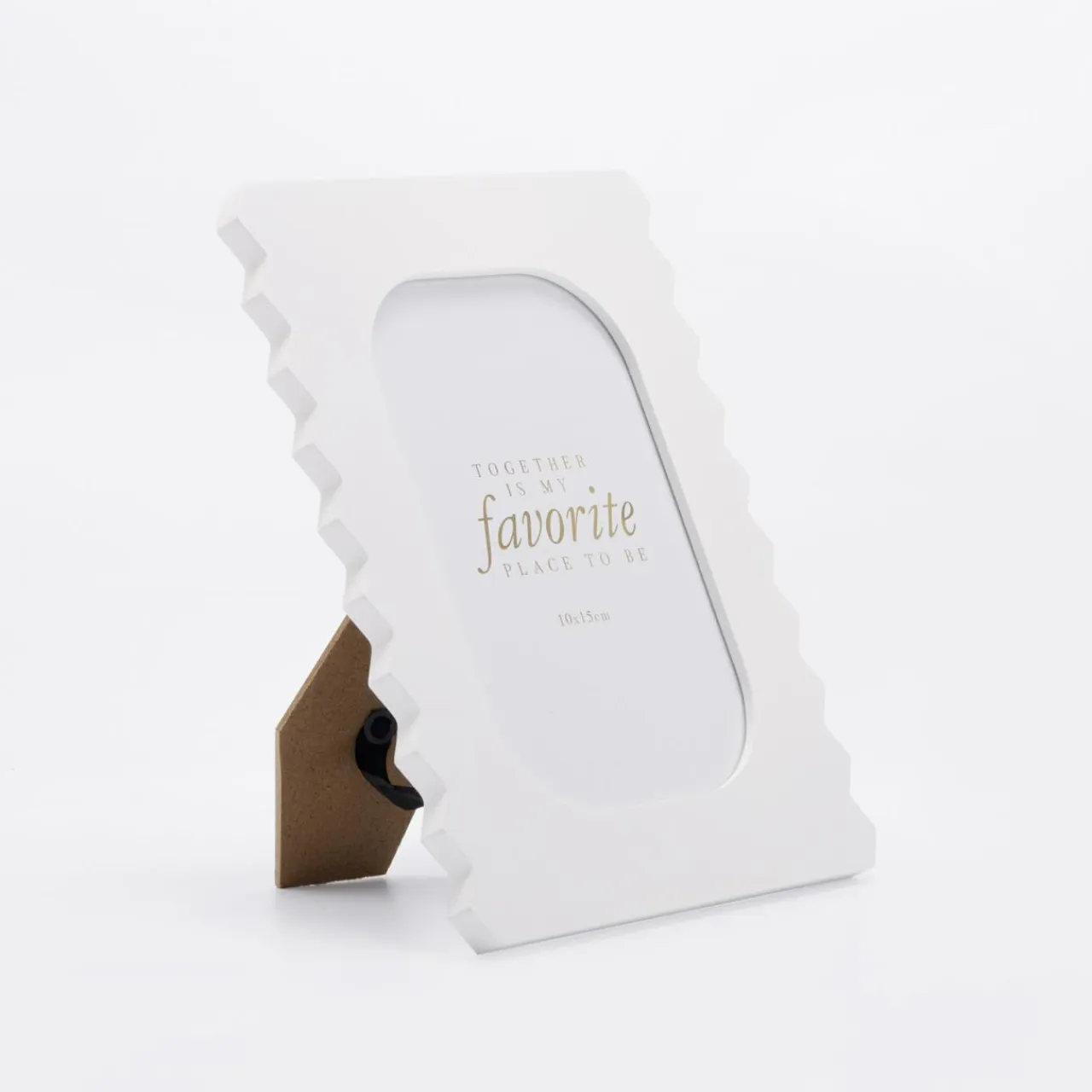 Dodaj swojemu wnętrzu subtelny akcent dzięki białej ramce na zdjęcie o ząbkowanym kształcie, która łączy nowoczesną prostotę z dekoracyjnym detalem. Doskonała, by wyeksponować najcenniejsze wspomnienia, wnosząc do pomieszczenia delikatny, a zarazem stylowy element.