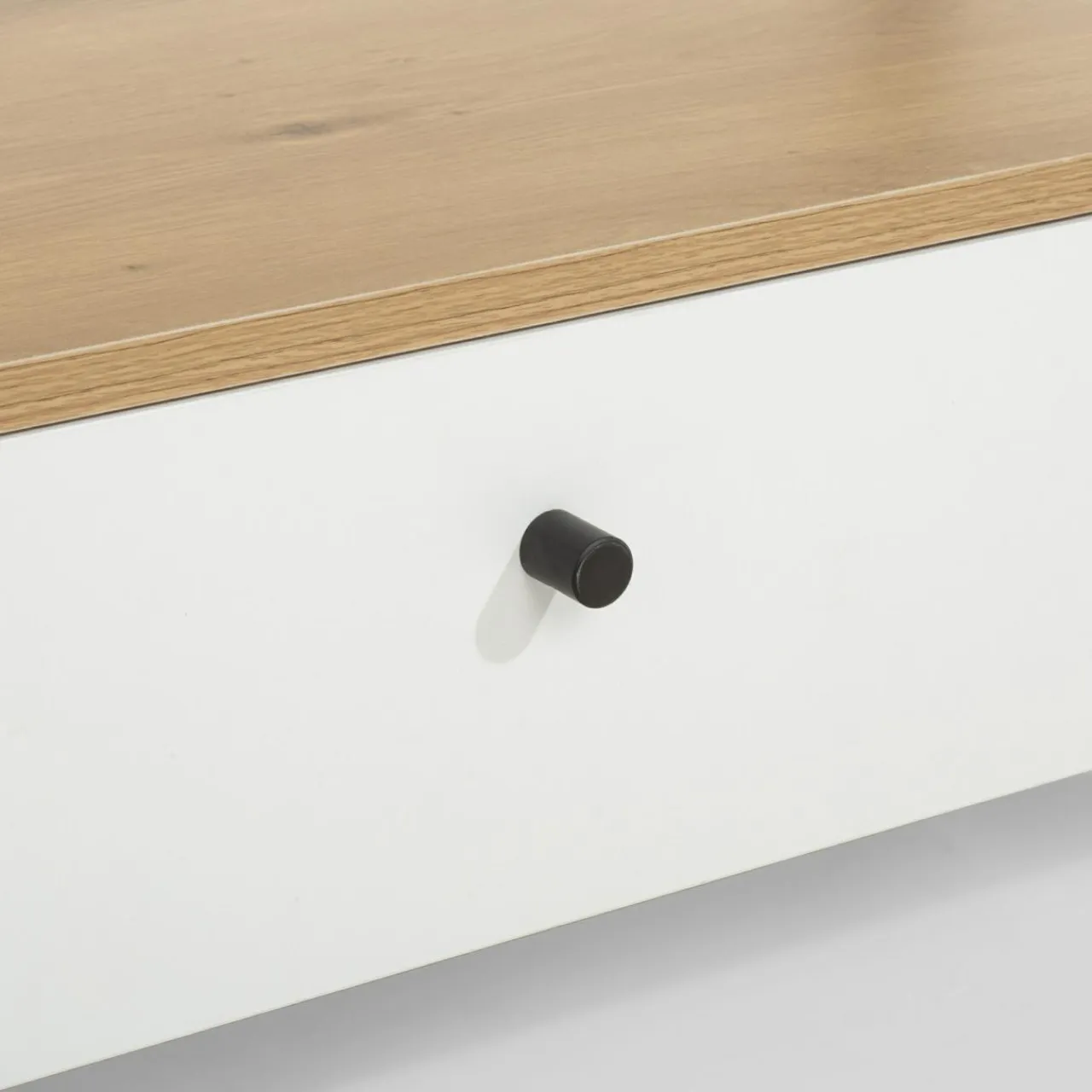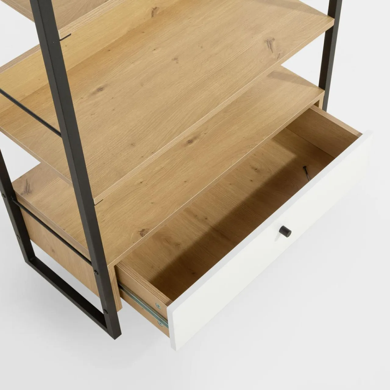 - Industrialny styl – metalowa rama w czarnym kolorze połączona z jasnym wykończeniem półek i szuflady tworzy nowoczesny wygląd.