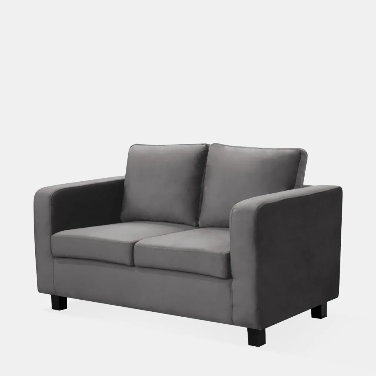Sofa 2-osobowa MINI MAX II w stalowym odcieniu łączy elegancję z komfortem, a delikatny połysk pluszu nadaje jej przytulnego charakteru.