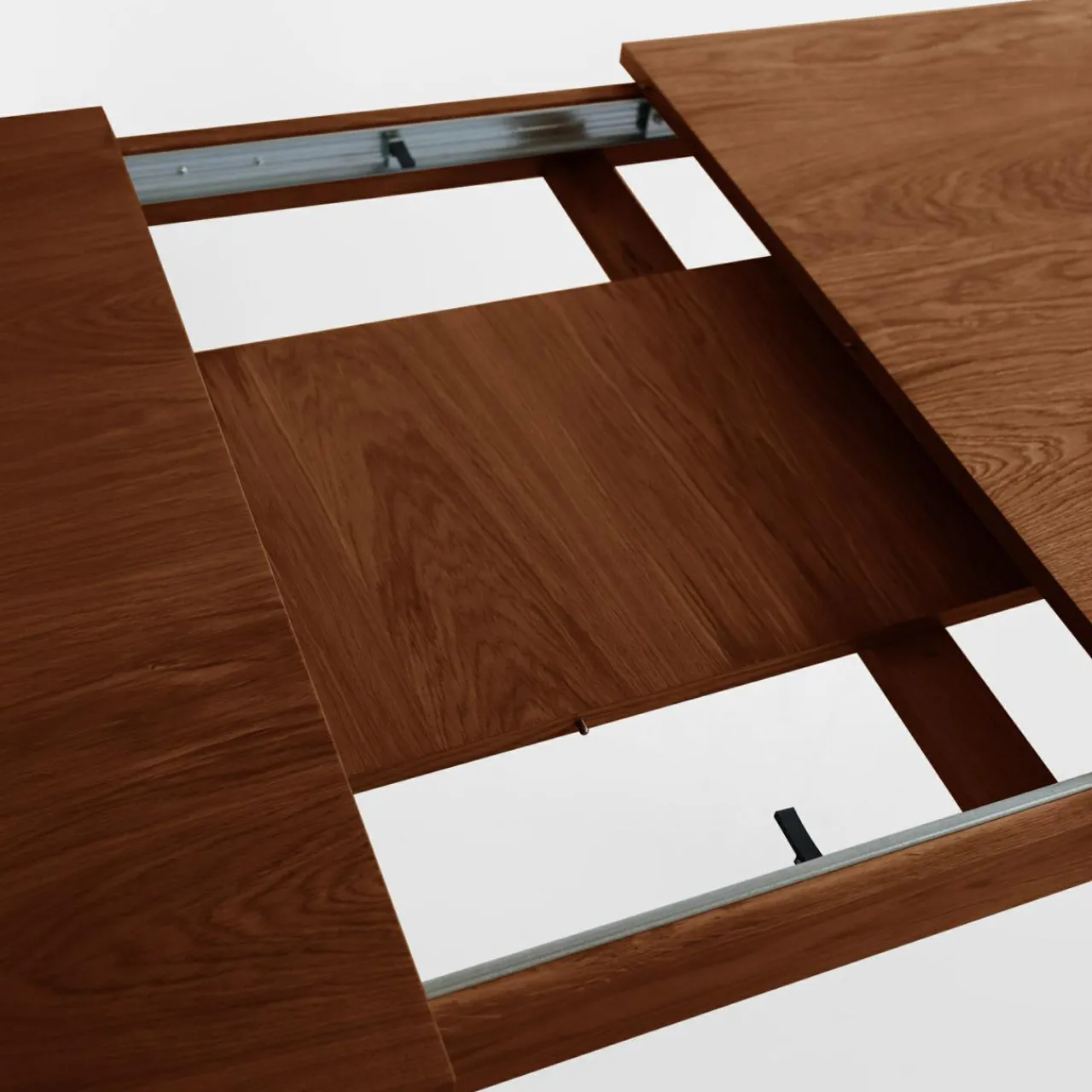 - Wkładka umieszczona w wewnątrz – znajduje się w środku stołu, co ułatwia jej szybki dostęp i montaż w razie potrzeby. Dzięki temu rozwiązaniu blat można rozłożyć w kilka chwil.