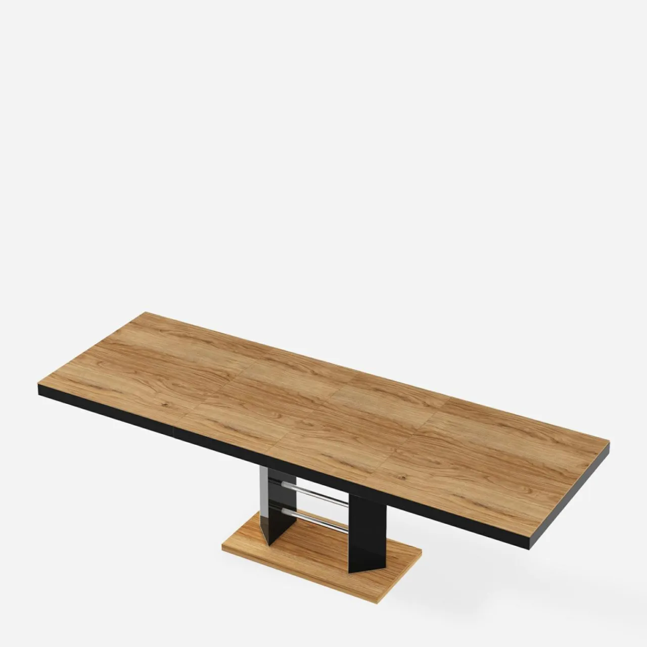 Blat i podstawa w laminacie dąb pradawny wprowadzają do wnętrza ciepły, naturalny akcent, a nogi w czarnym połysku nadają nowoczesnego wyrazu.