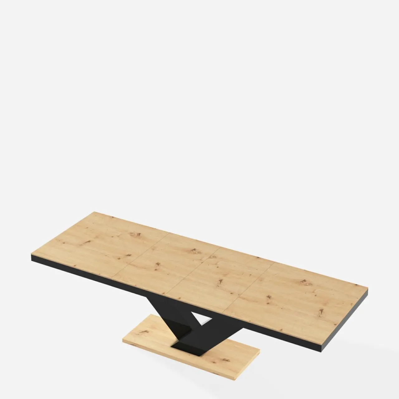 Blat i podstawa w wybarwieniu dąb artisan kontrastują z nogami w czarnym połysku, tworząc elegancki punkt w jadalni lub salonie.