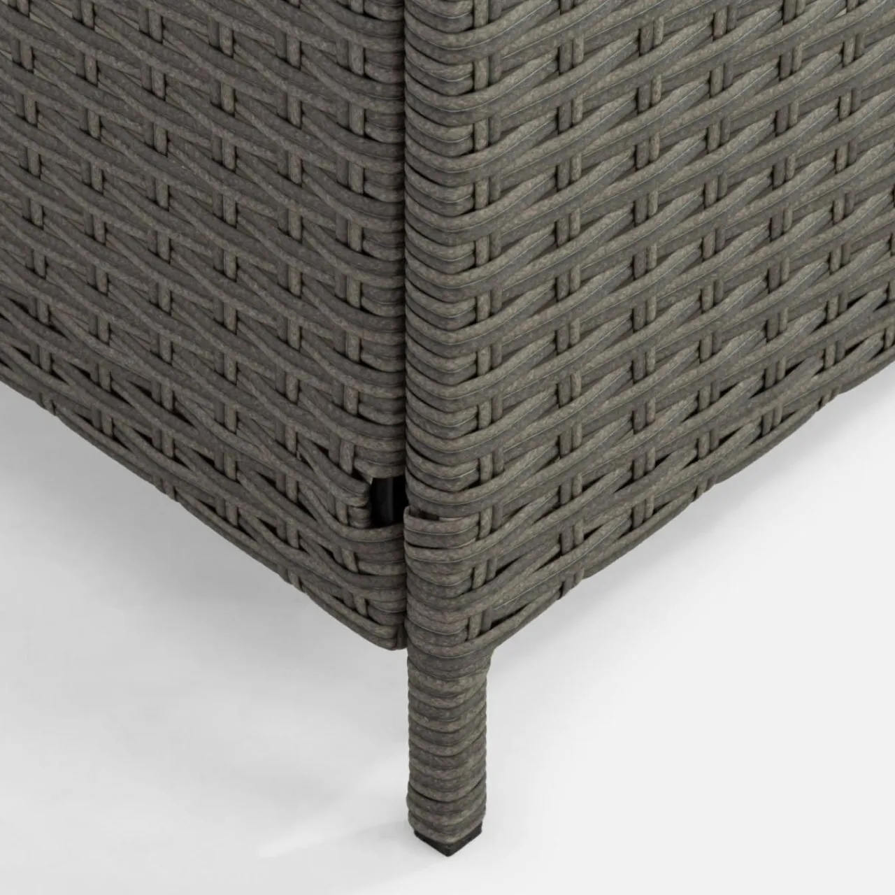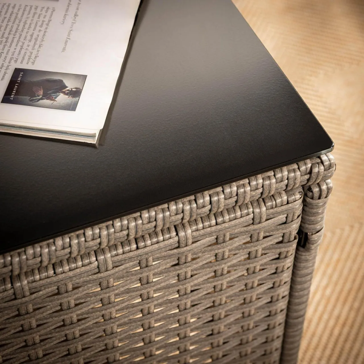 - Elegancki wygląd — stelaż dopełnia plecionka z tworzywa sztucznego, dzięki której mebel prezentuje się nowocześnie i elegancko.