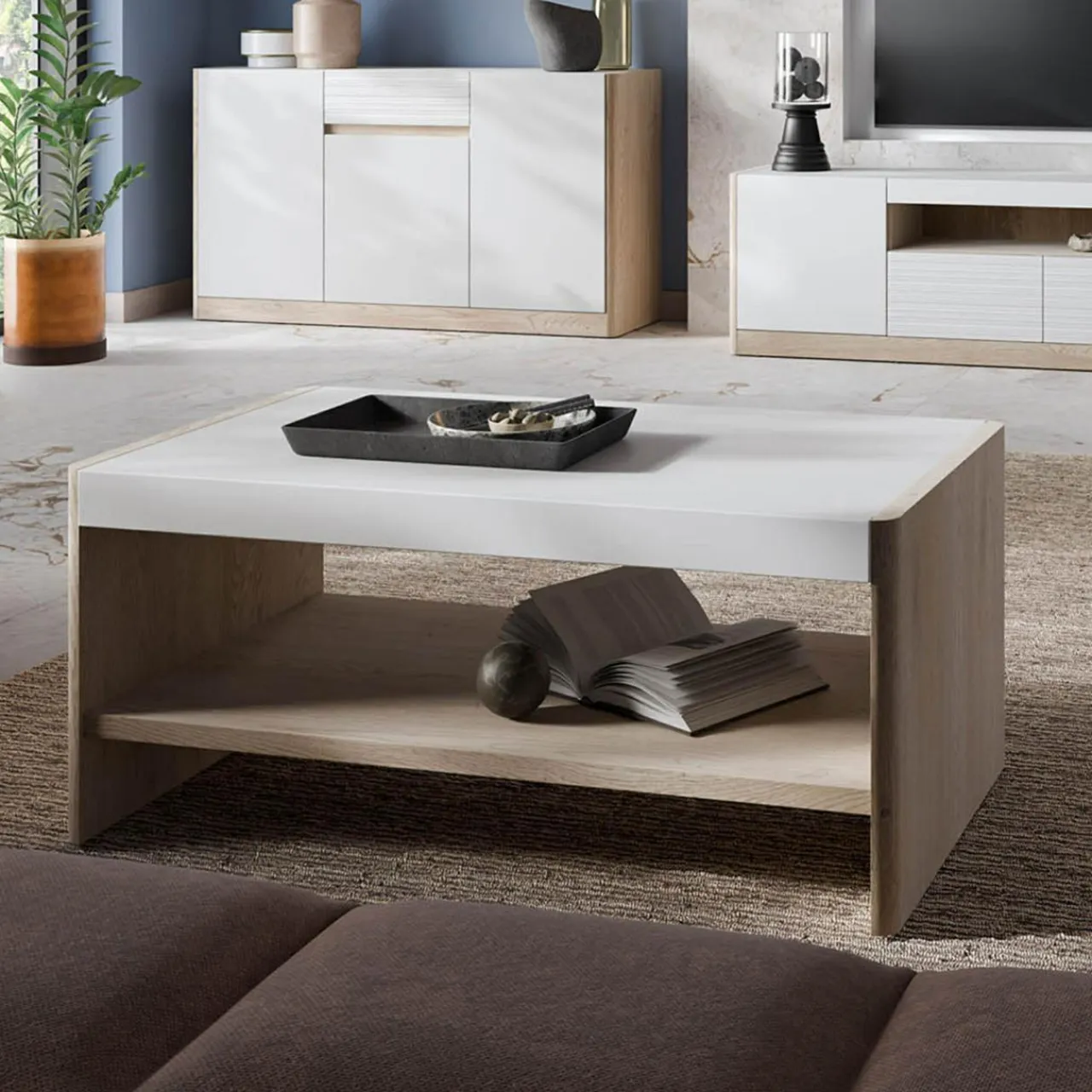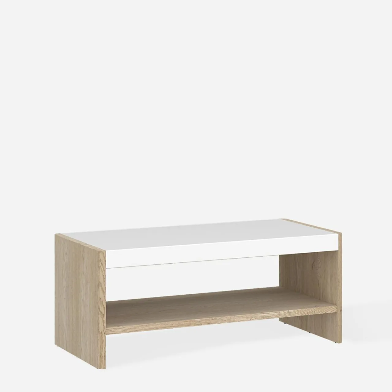 Stolik CALIMA w kolorze dąb Cremona oraz biały idealnie sprawdzi się w jasnych i nowoczesnych przestrzeniach, dodając lekkości aranżacji. Dzięki prostemu designowi i praktycznym rozwiązaniom, ten stolik jest wyborem dla osób ceniących estetykę i porządek.