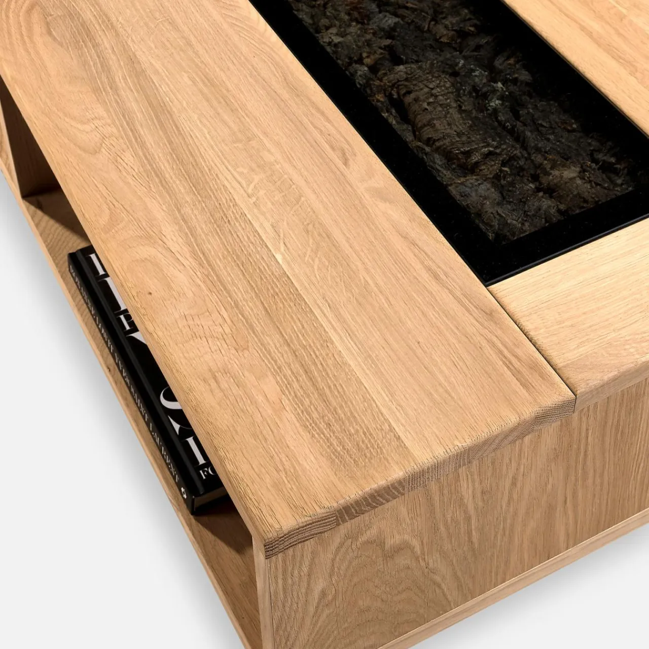 - Piękny bez obrusów — na środku blatu znajduje się przeszklony panel wypełniony korą. Wyjątkowy element sam stanowi dekorację, która zaskoczy siedzących wokół mebla!