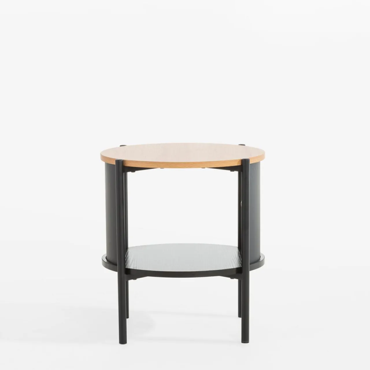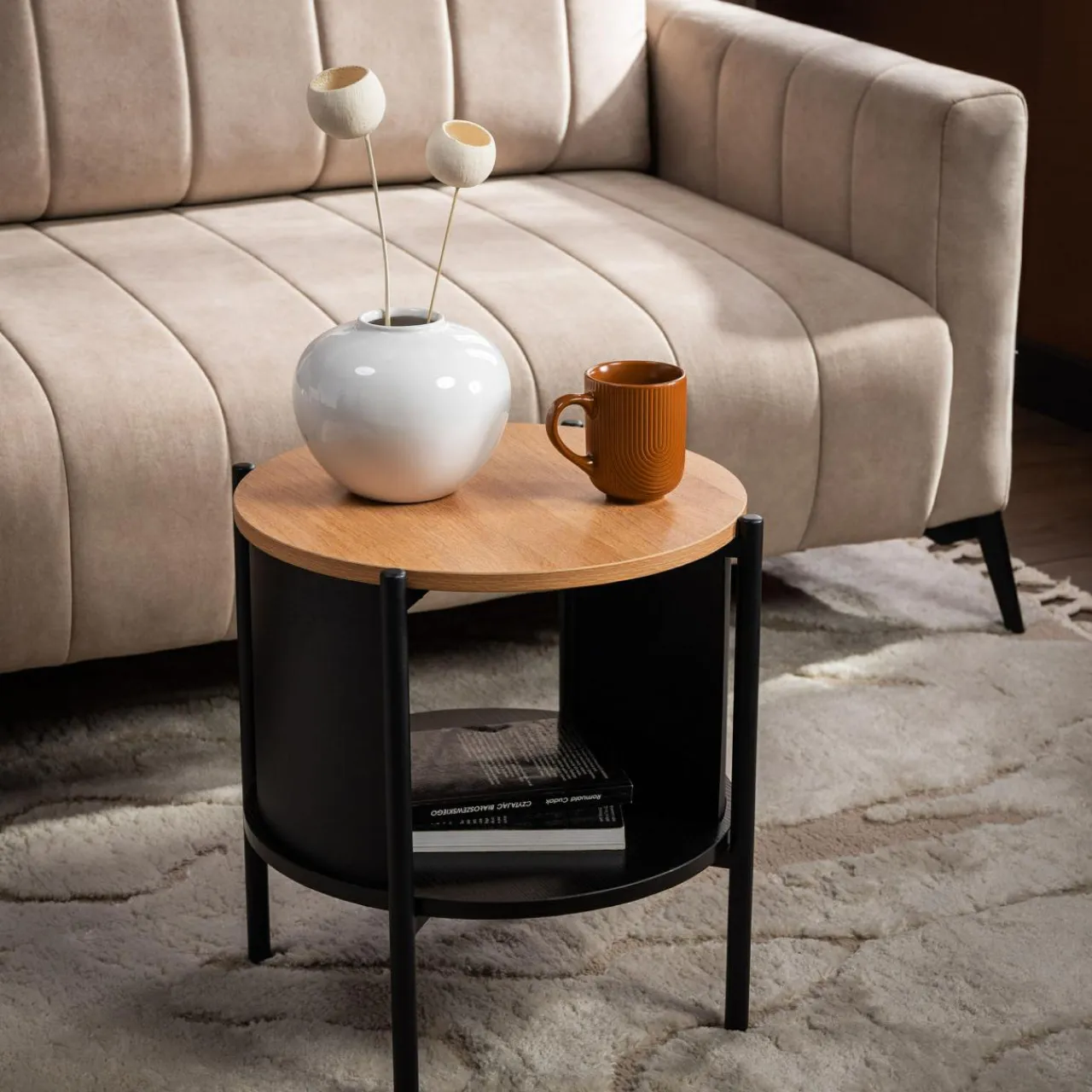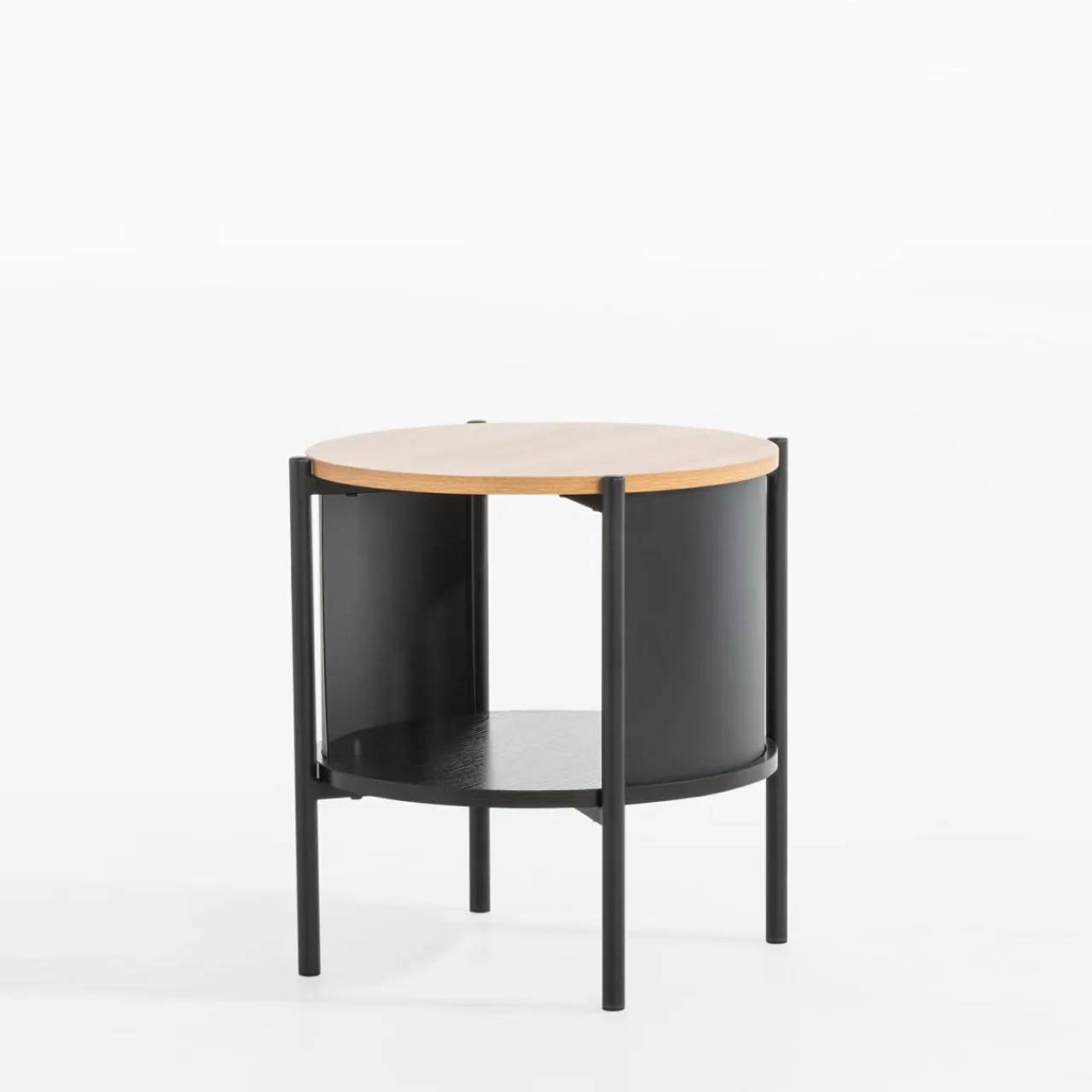 Stolik HILTO świetnie dopełni nowoczesne i industrialne aranżacje, dzięki połączeniu czarnego metalu i imitacji drewna w jasnym i ciemnym wybarwieniu. Okrągły kształt stolika złagodzi linie aranżacyjne.