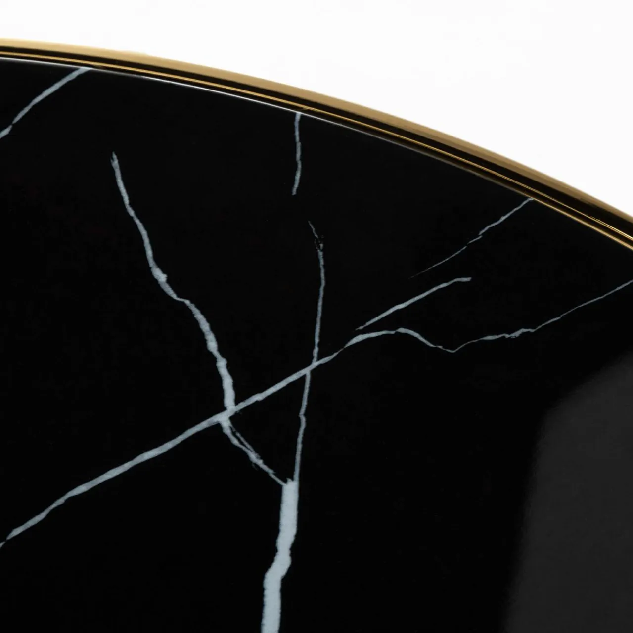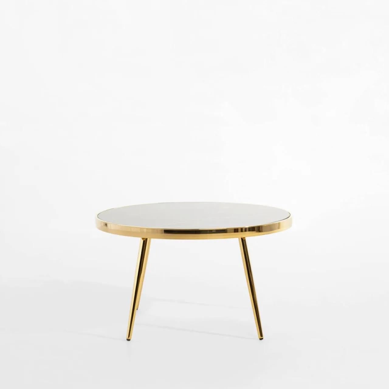 Ze stolikiem kawowym EFUZZO zamienisz swój pokój dzienny w nowojorski apartamentowiec. Stolik łączy w sobie szklany blat z marmurowym dekorem i konstrukcję ze złotej stali nierdzewnej.