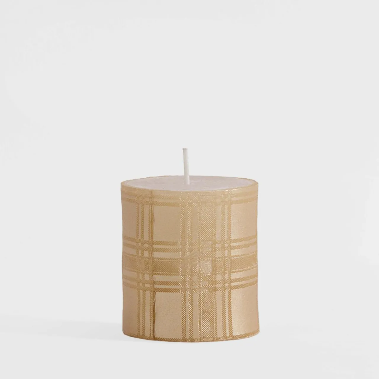 Świeca w eleganckim kolorze szampana to subtelna dekoracja, która wprowadza do wnętrza ciepło i elegancje. Jej klasyczny kształt walca i delikatny wzór kraty sprawiają, że idealnie wpisuje się w różnorodne style aranżacji, od nowoczesnego po glamour.