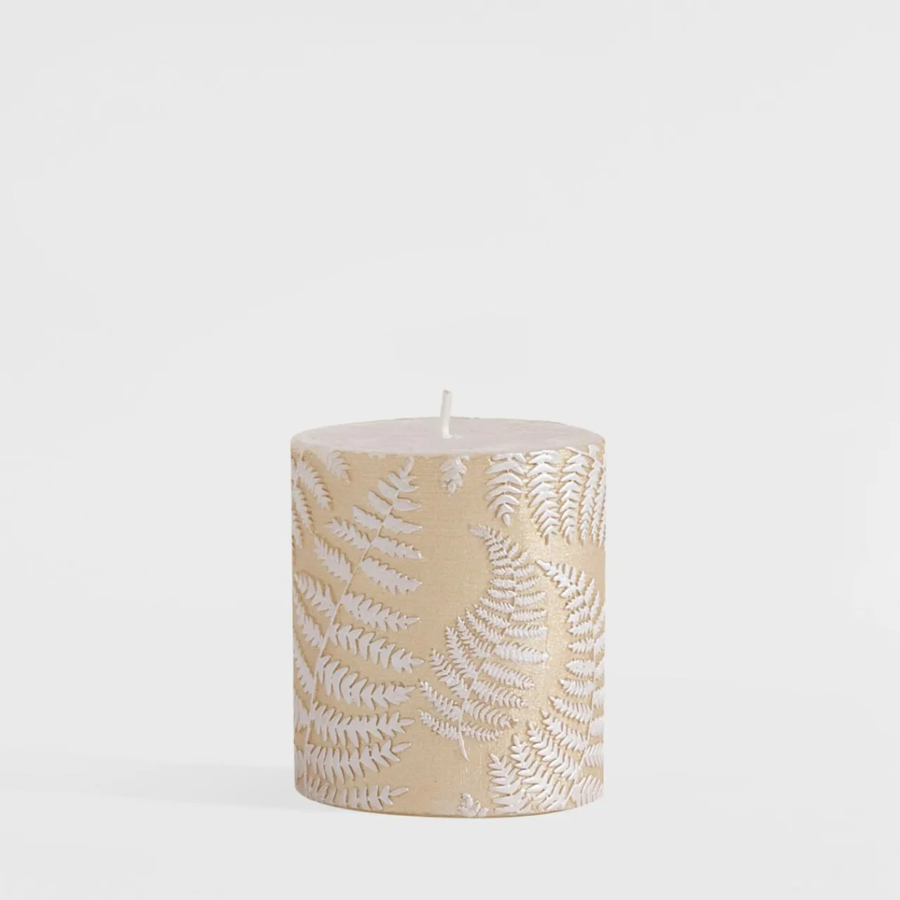 Świeca ozdobiona wzorem paproci w delikatnych odcieniach szampana z perłową poświatą, to doskonały wybór do stworzenia nastrojowej atmosfery i wzbogacenia dekoracji wnętrza.