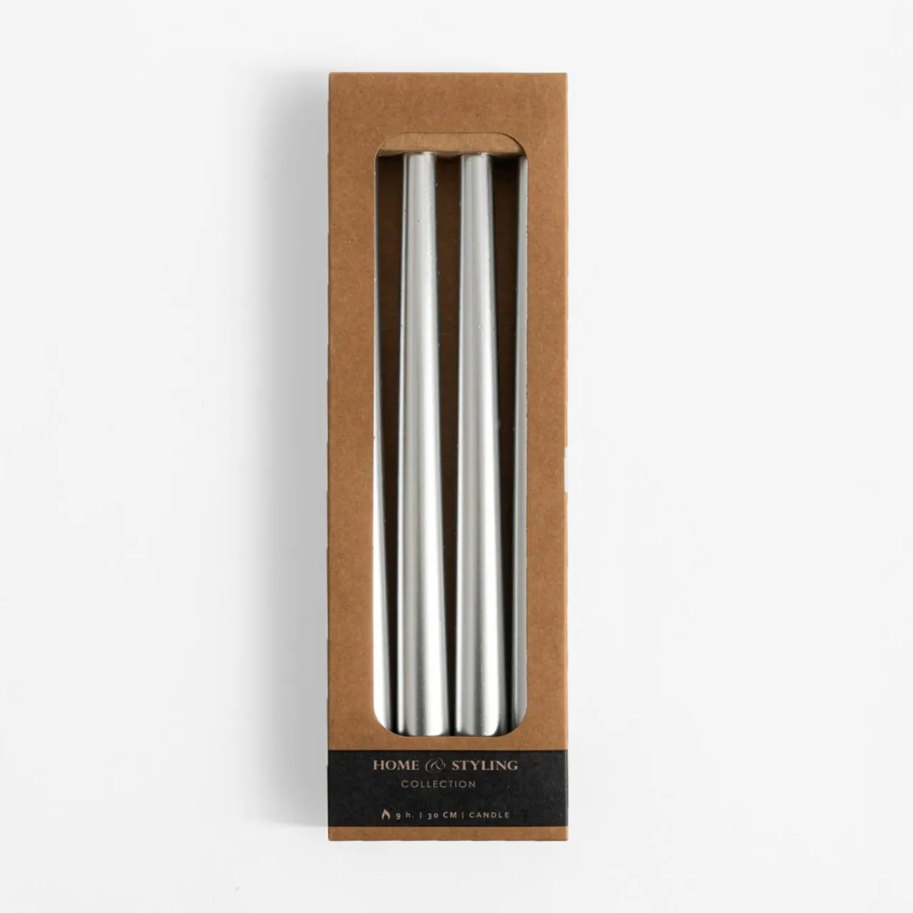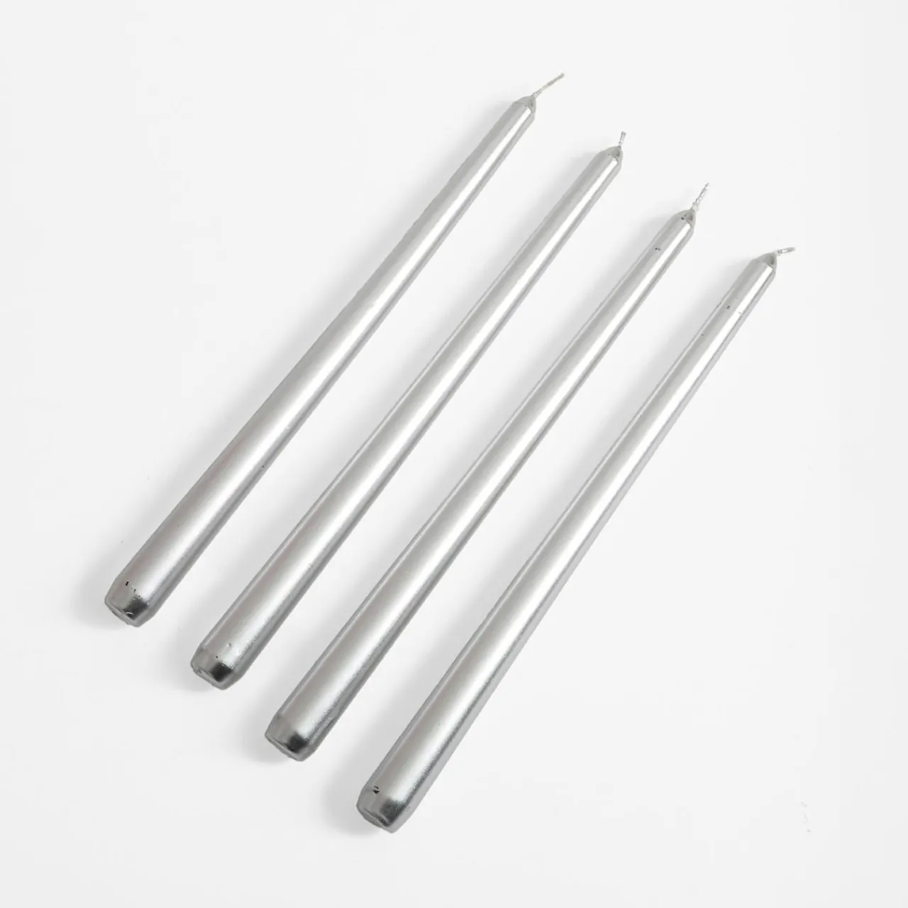 W komplecie 4 sztuki świec w srebrnym kolorze o wysokości 30 cm.