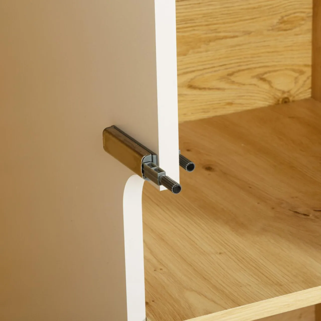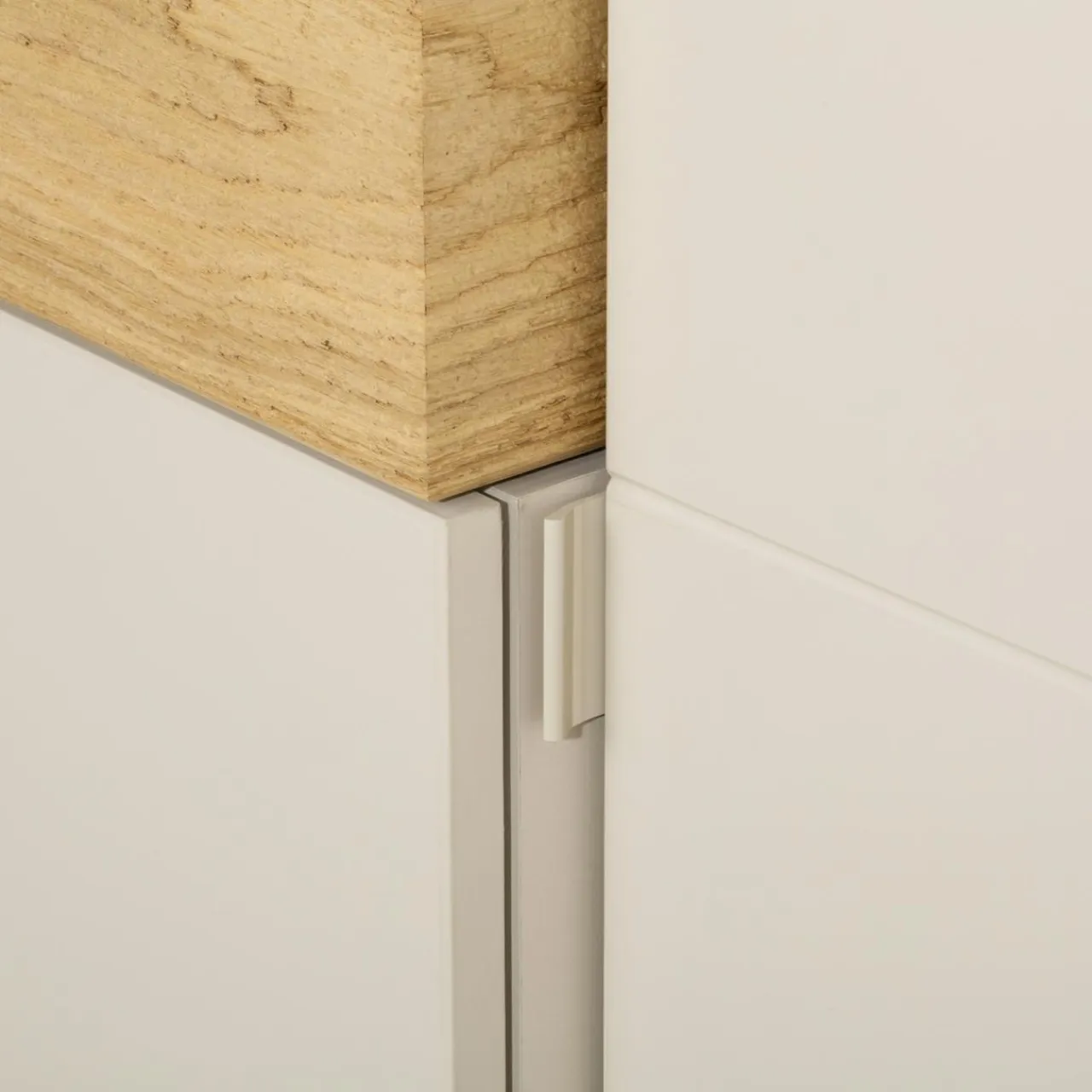 Beżowe bryły rozjaśnią wnętrze, a fronty ze wstawkami z prawdziwego drewna w kolorze dąb artisan nadadzą naturalnego akcentu.