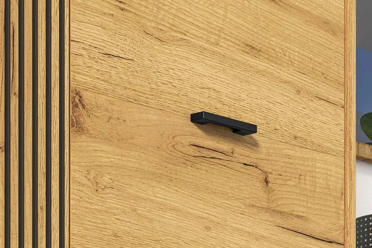 - Czarne elementy stanowią kontrast dla wybarwienia dębu craft złoty, podkreślając jego ciepły kolor.
