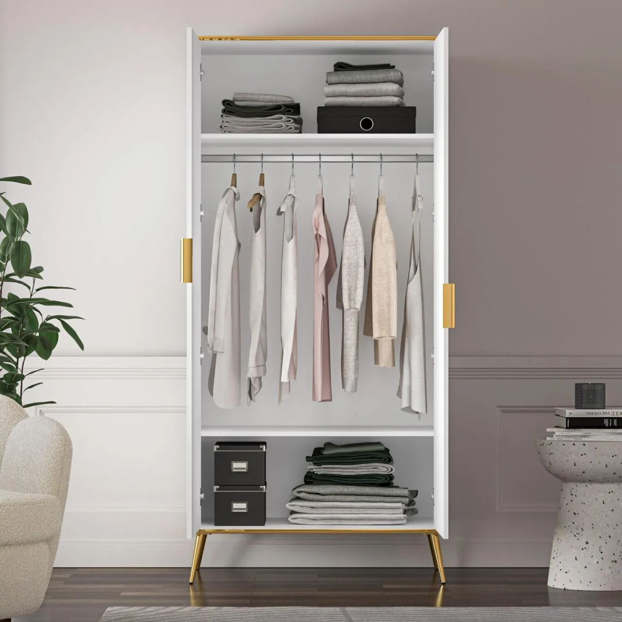 Z szafą VITERBO wszystkie kurtki, płaszcze lub koszule w jednym miejscu. Pozostałą część lub dodatki poukładaj w 2 szerokich wnękach.