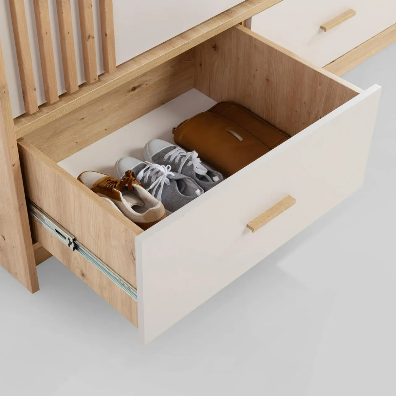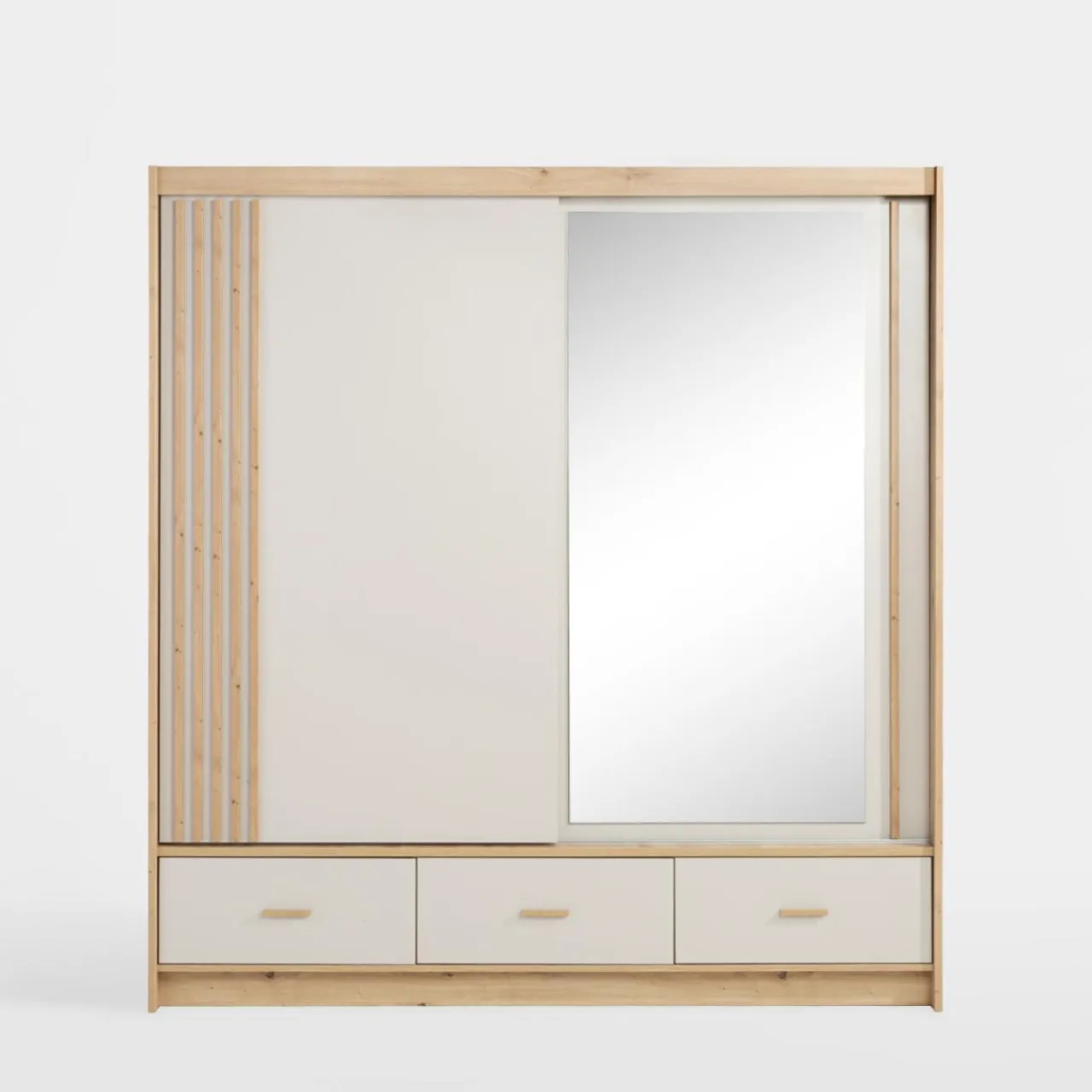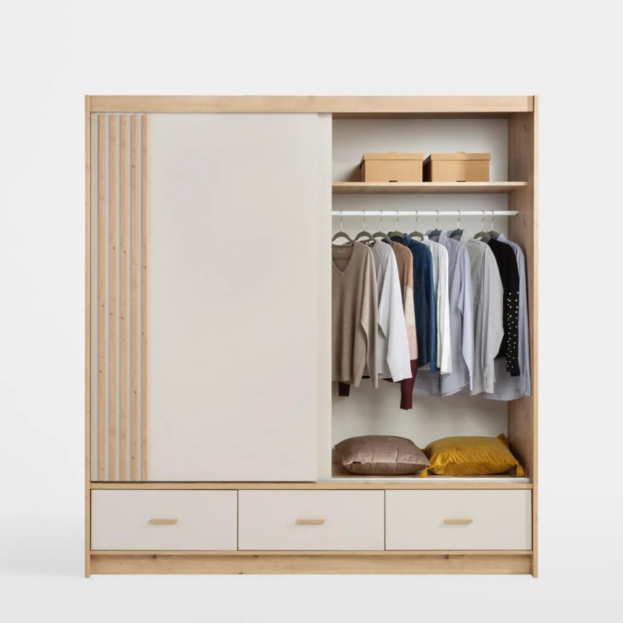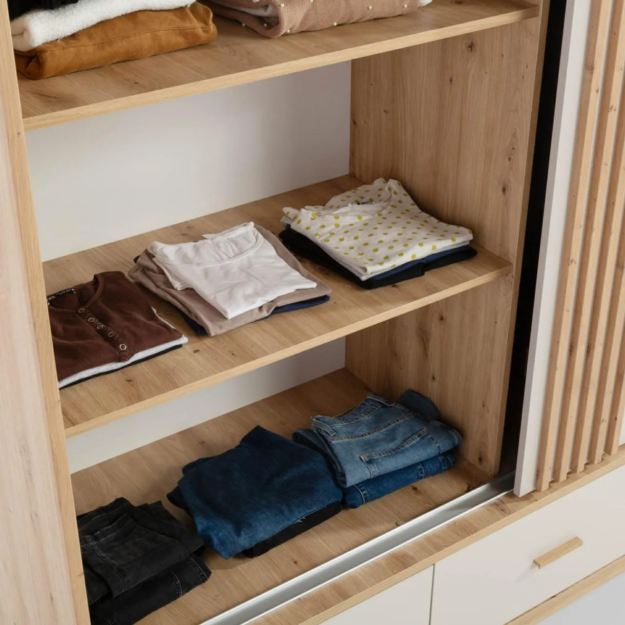 W szafie NEVADA wszystko będzie na swoim miejscu. Ubrania i dodatki poukładasz na półkach, a bieliznę i pozostałe przedmioty schowasz w 3 szufladach.