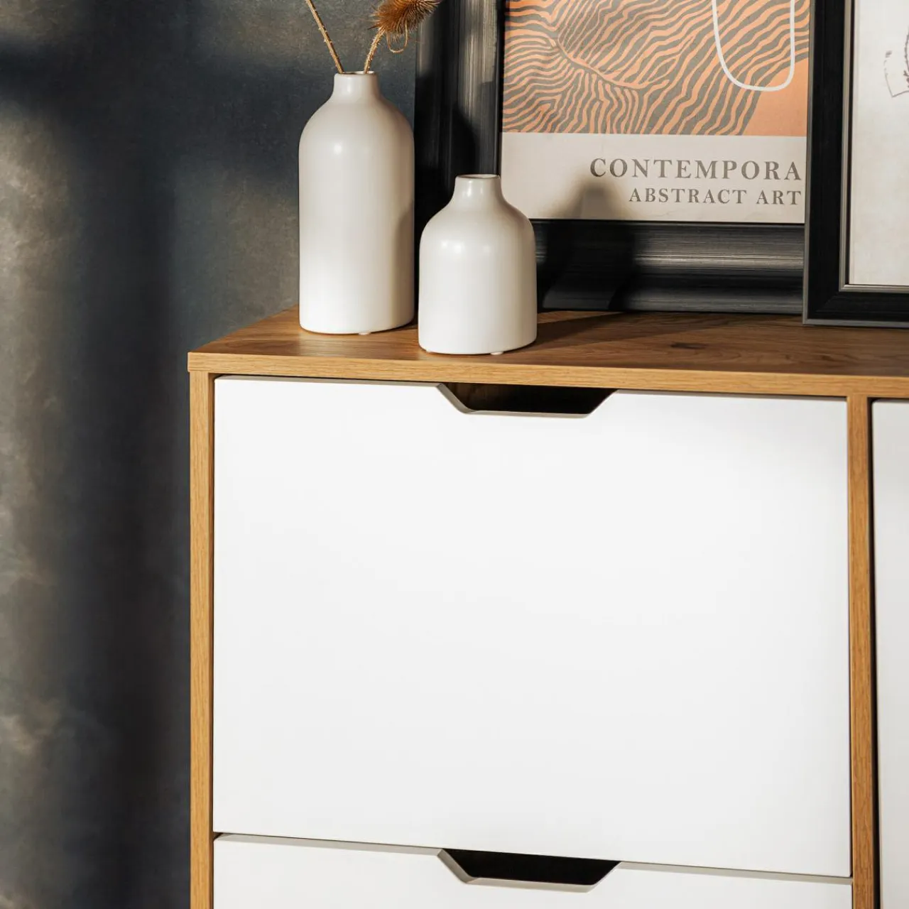 Nowoczesna bryła łączy w sobie barwę jasnego drewna z gładką płytą MDF w kolorze białym. Jasne kolory rozjaśnią przedpokój i optycznie go powiększą.
