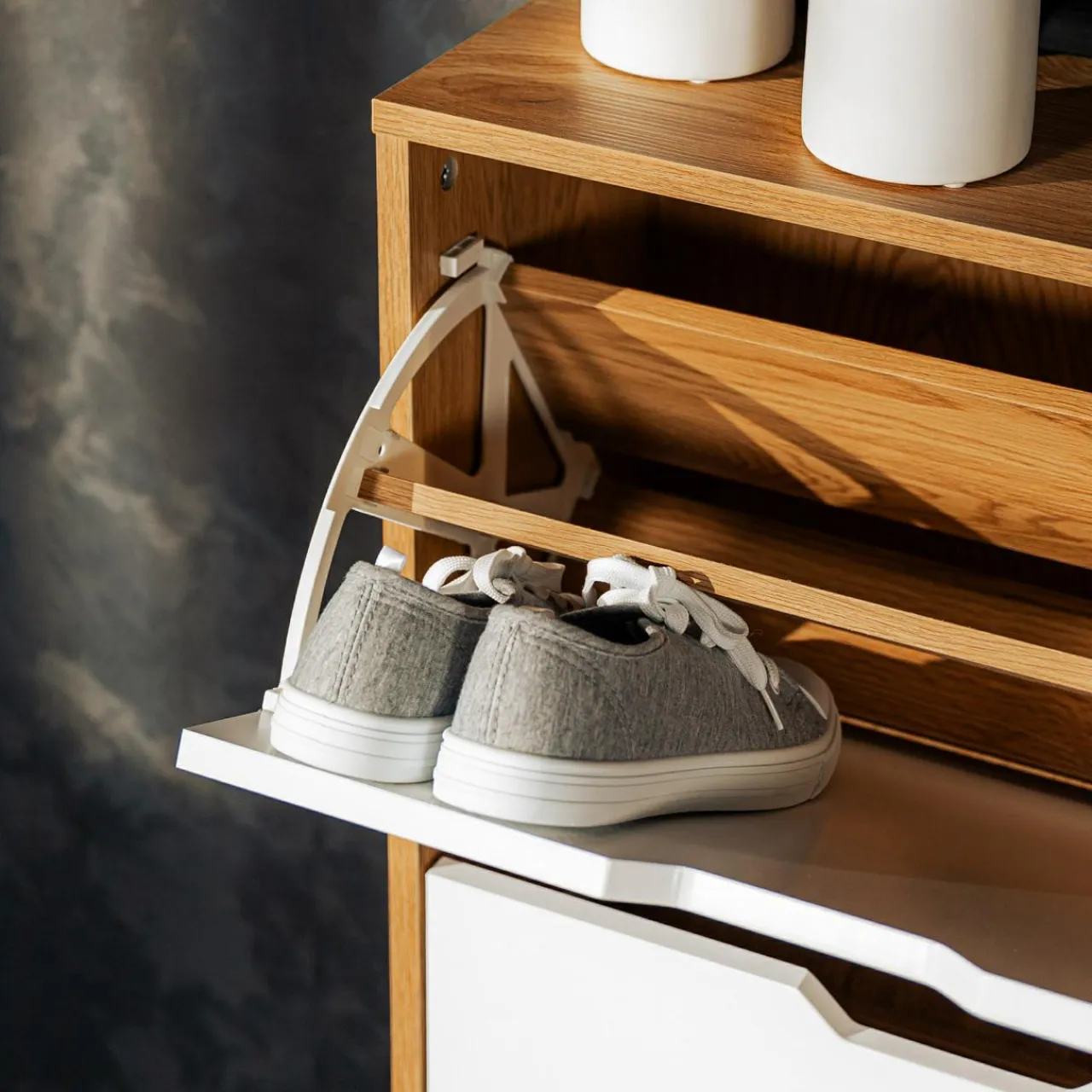- 3 uchylane wnęki pozwolą Ci uporządkować w szeregu pary butów.