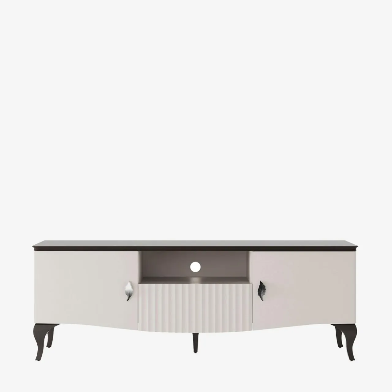 - Nietuzinkowe uchwyty z liściem pełnią rolę funkcjonalną, ale także stanowią ozdobę pomieszczenia. Ciemne, metalowe listki wyróżniają na tle frontów w odcieniach savany i kaszmiru.