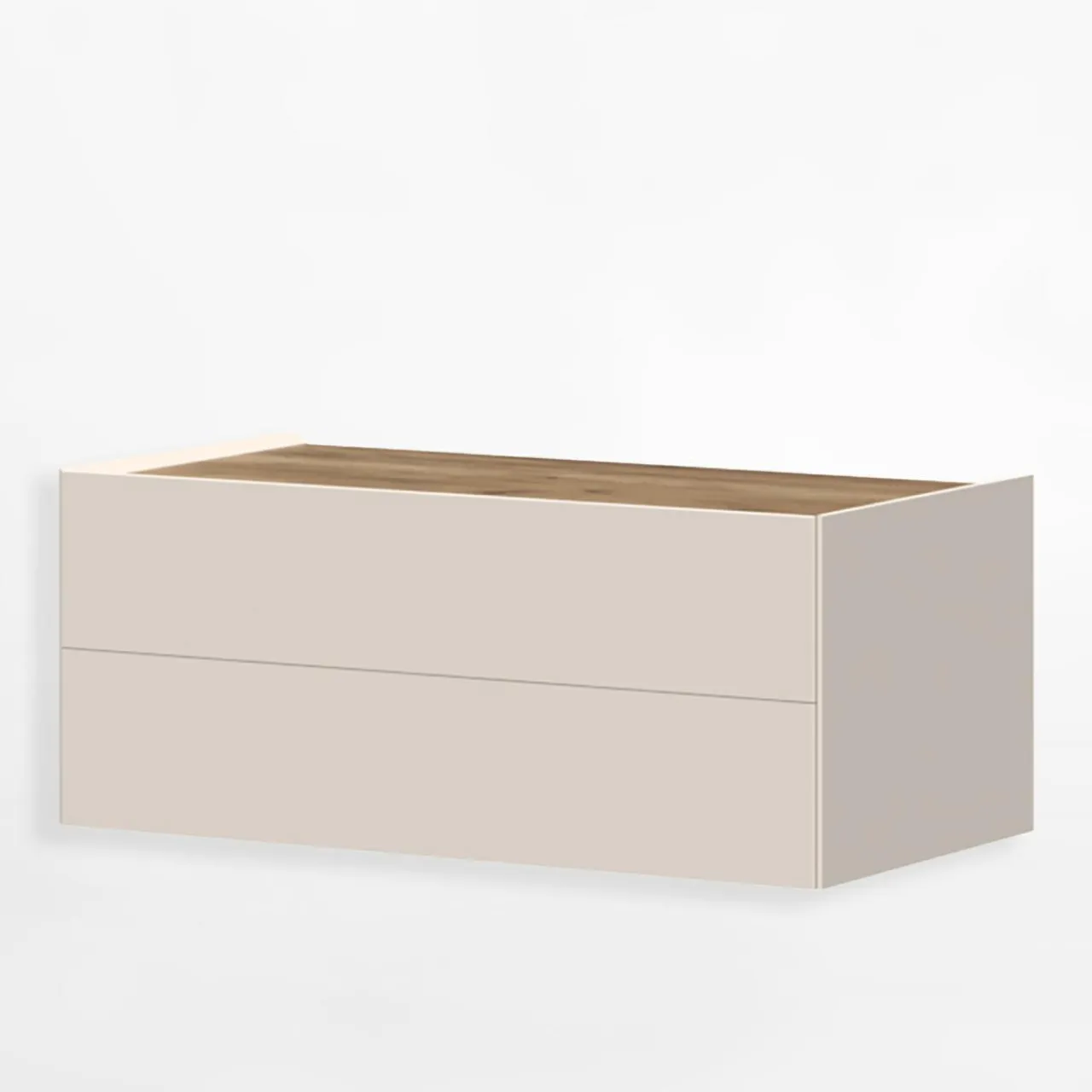 Kolekcja SKY45 to nowoczesne meble w kolorze kaszmiru z ciepłymi akcentami dębu tobacco. Prosta forma, starannie dopracowane detale i opcjonalne oświetlenie LED sprawiają, że idealnie pasują do współczesnych wnętrz. System cichego domyku, pojemne szuflady i wysokie nóżki zapewniają wygodę użytkowania i łatwość utrzymania porządku.