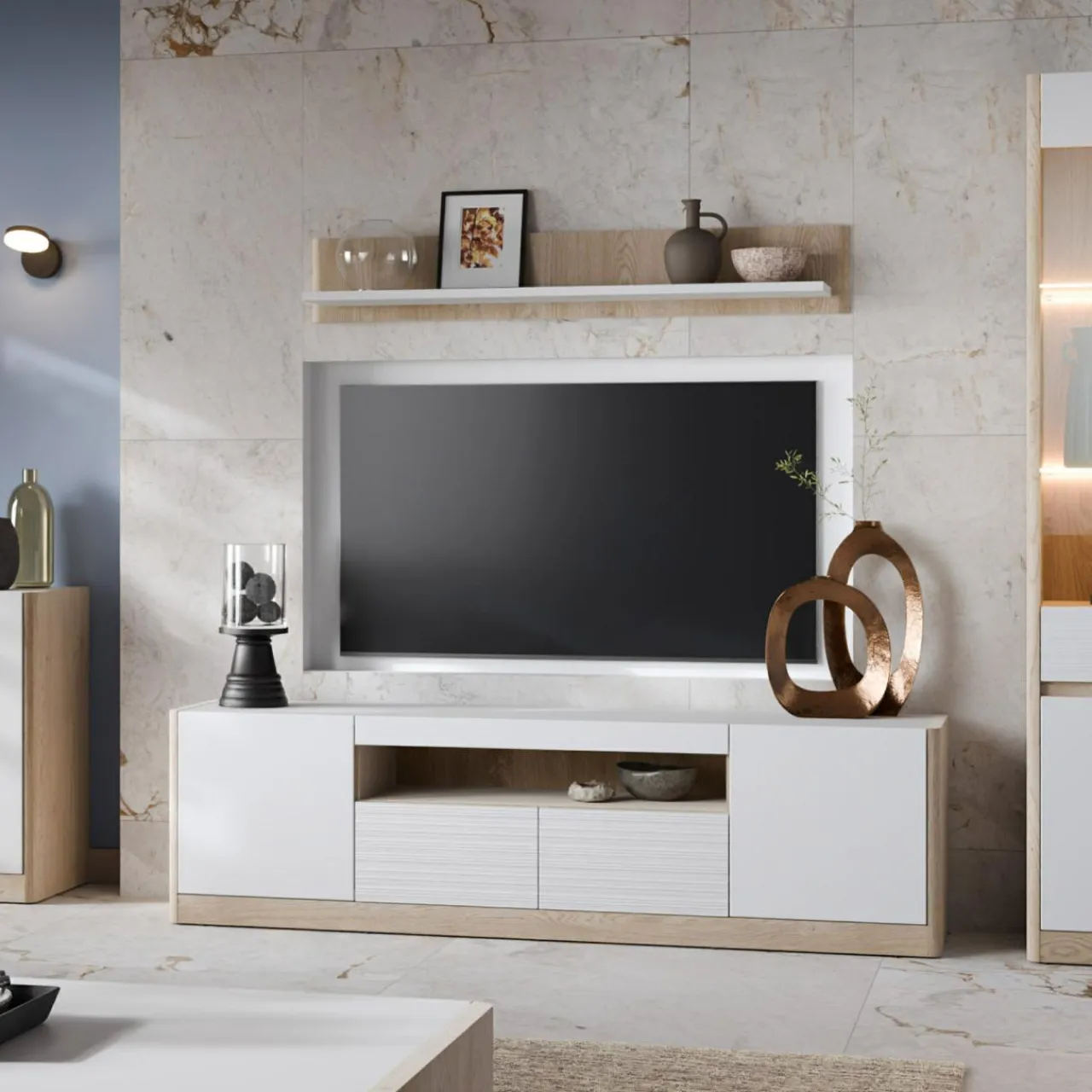 Meble w kolorach dębu Cremona i bieli Alpin, które wprowadzają świeżość i nowoczesny styl do wnętrz. Praktyczne układy sprawiają, że sprawdzą się w salonie, sypialni czy jadalni. Łączą estetykę jasnego drewna z minimalistycznym wzornictwem, podkreślając charakter przestrzeni.