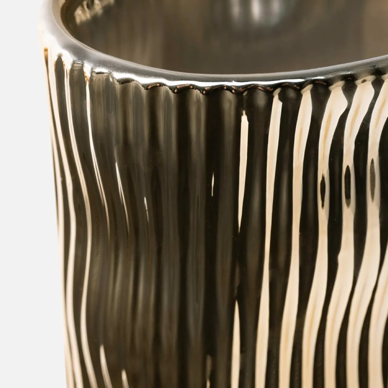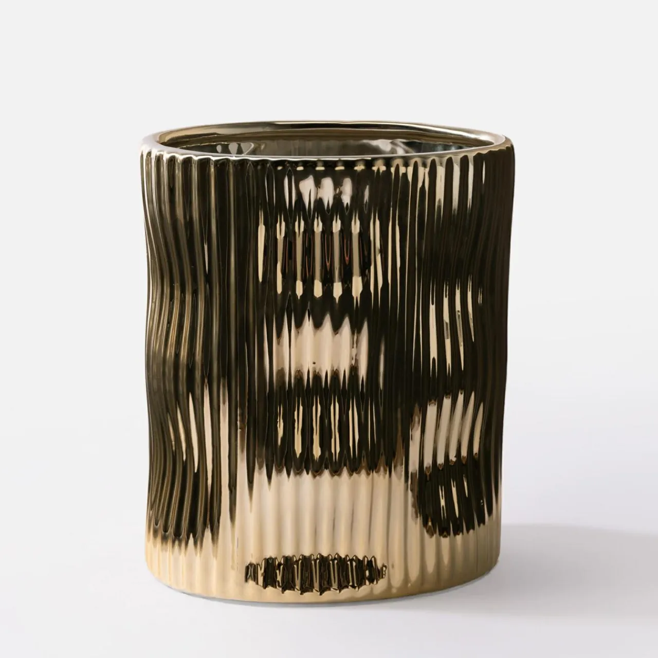 W obecnych trendach aranżacji wnętrz – wazony to nie tylko naczynie na kwiaty, ale również wyjątkowa ozdoba pomieszczenia. Nasz złoty ryflowany wazon pomoże Ci wyeksponować żywe kompozycje kwiatowe, suche trawy, ale również sam w sobie będzie ciekawą dekoracją jadalni, salonu lub przedpokoju.