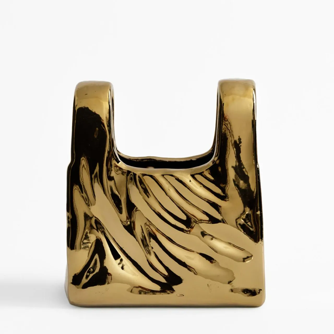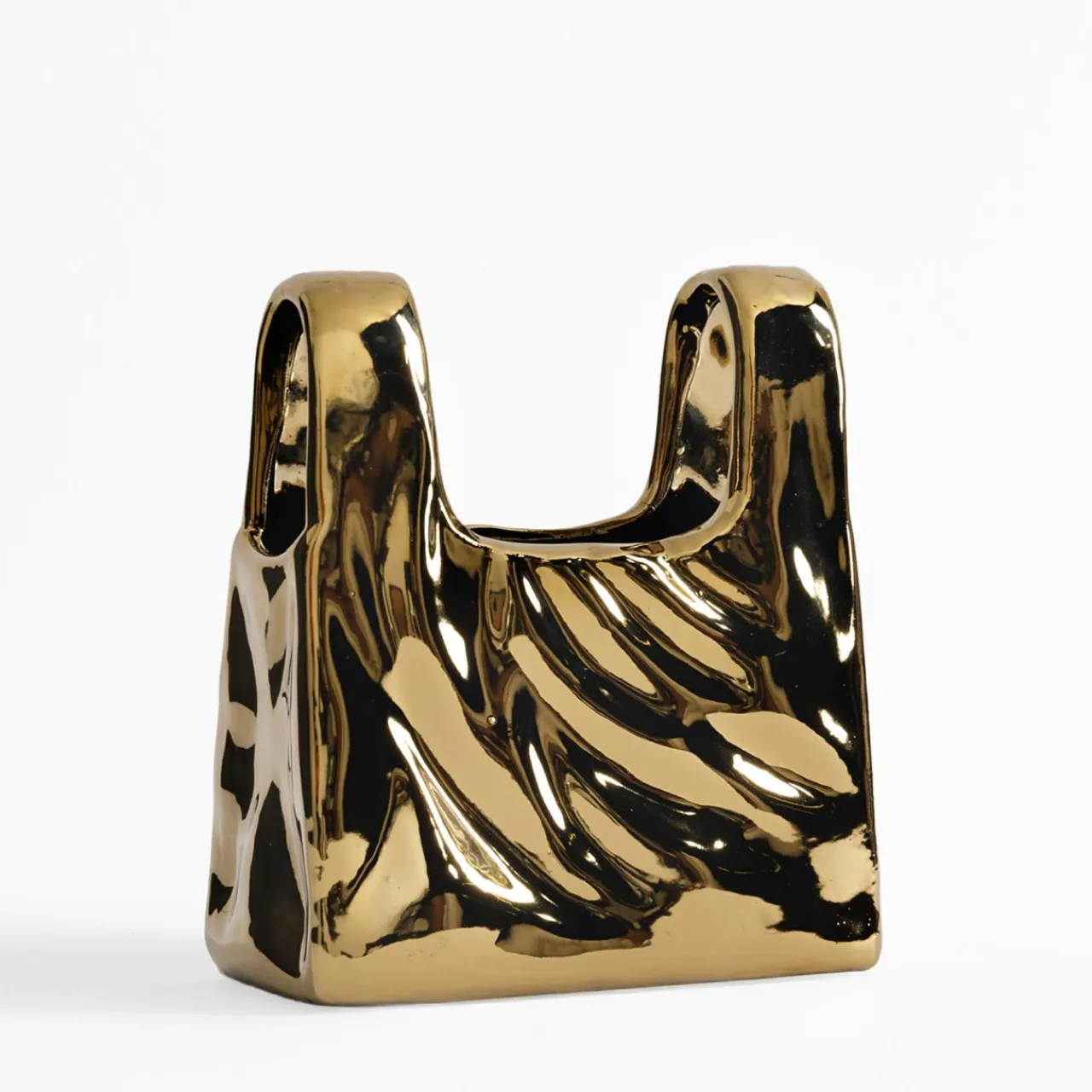Złoty wazon w kształcie torby to oryginalny dodatek, który przyciąga wzrok i dodaje nietuzinkowego akcentu. Nietypowy design sprawia, że świetnie wpisuje się w swobodny styl glamour i nowoczesny. Złoty kolor wazonu rozjaśni kolory aranżacji.