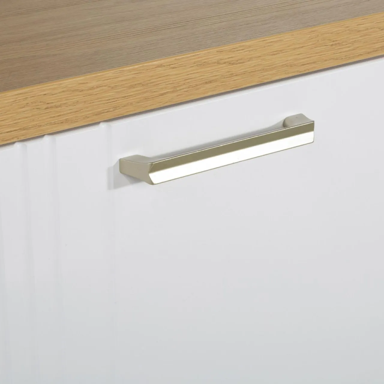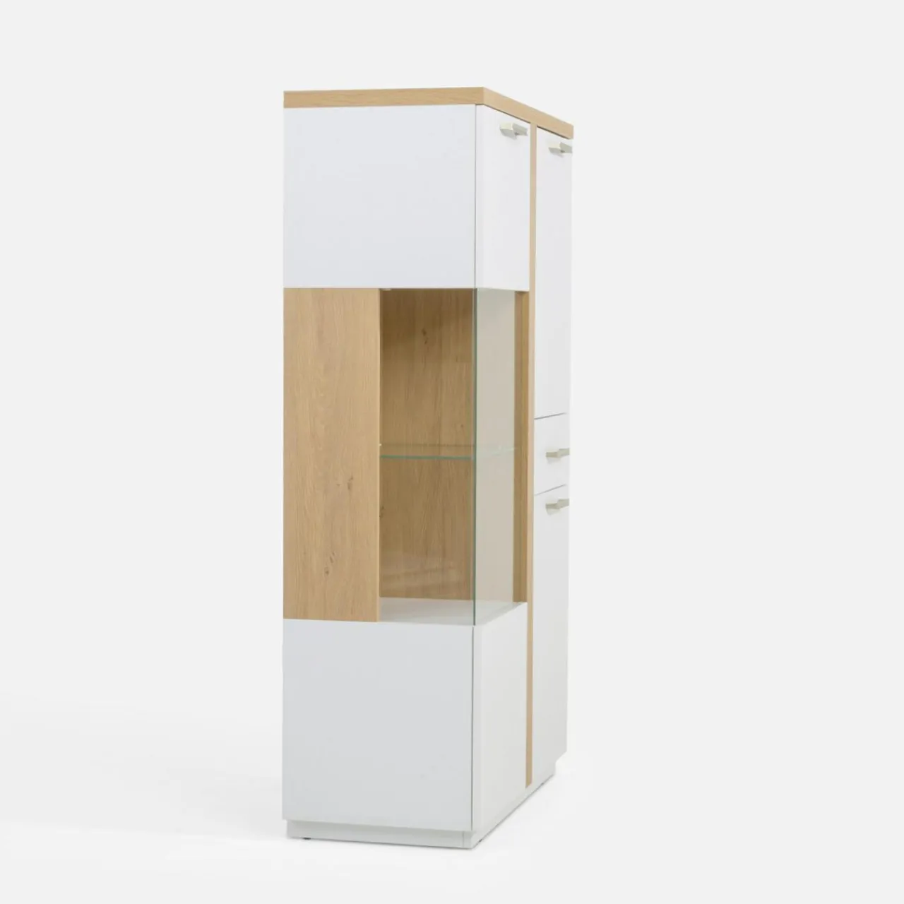 - Piękny wygląd: biała witryna z dodatkiem barwy kamiennego dębu dobrze sprawdza się w stylu nowoczesnym.