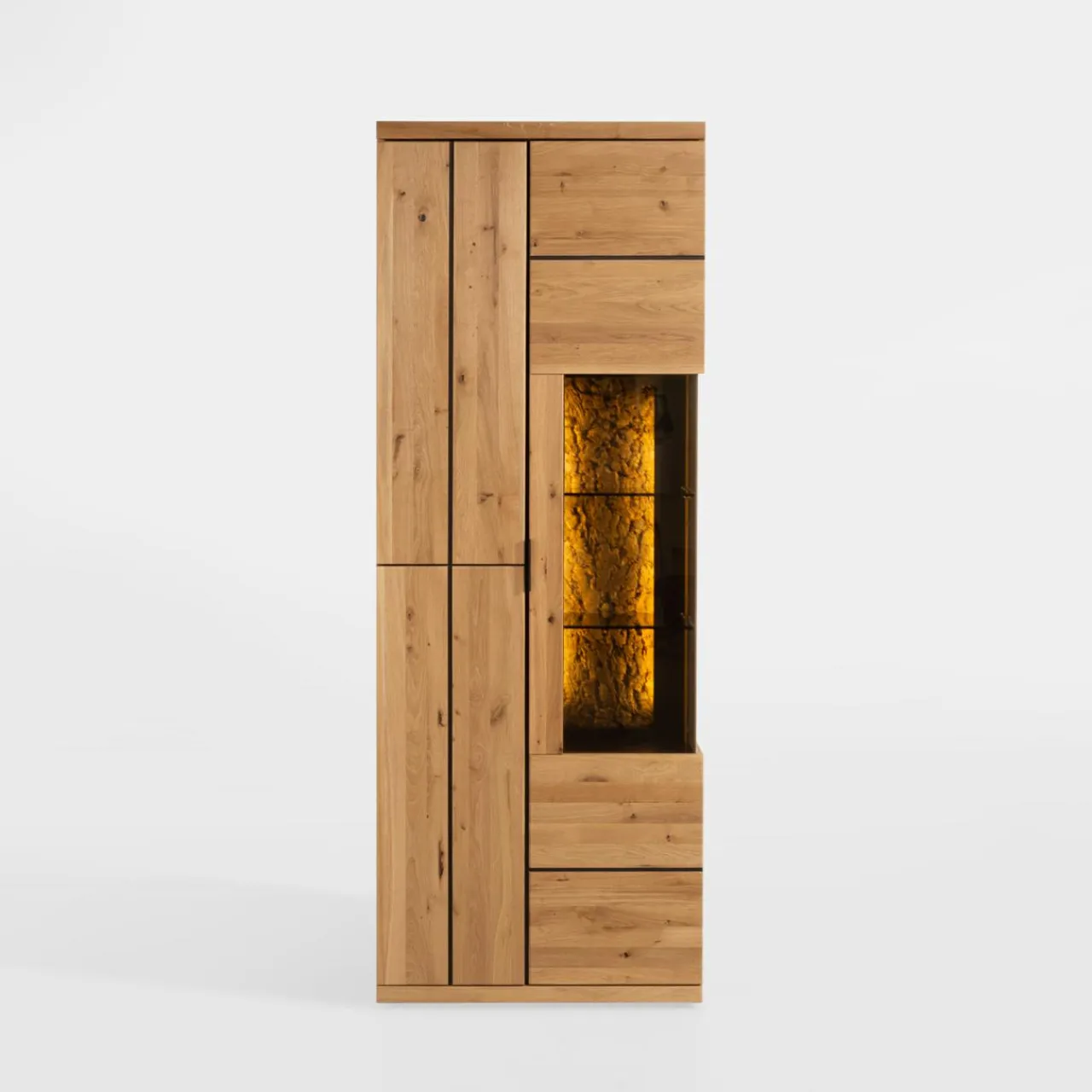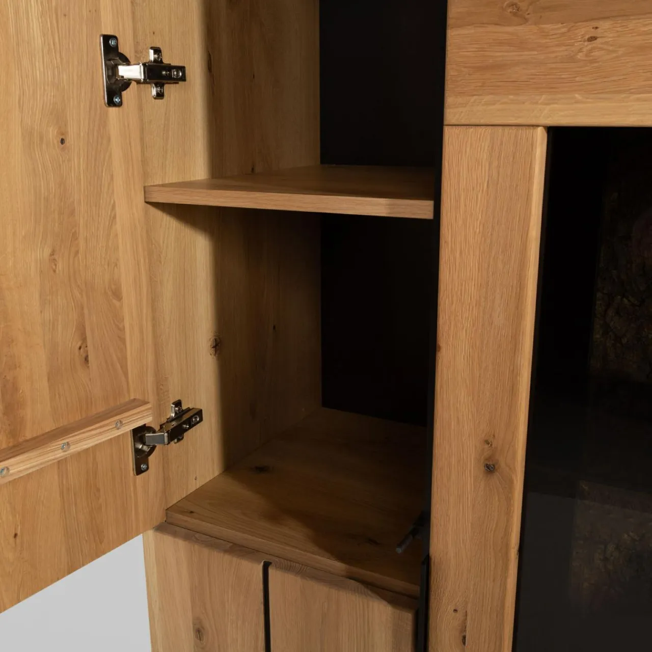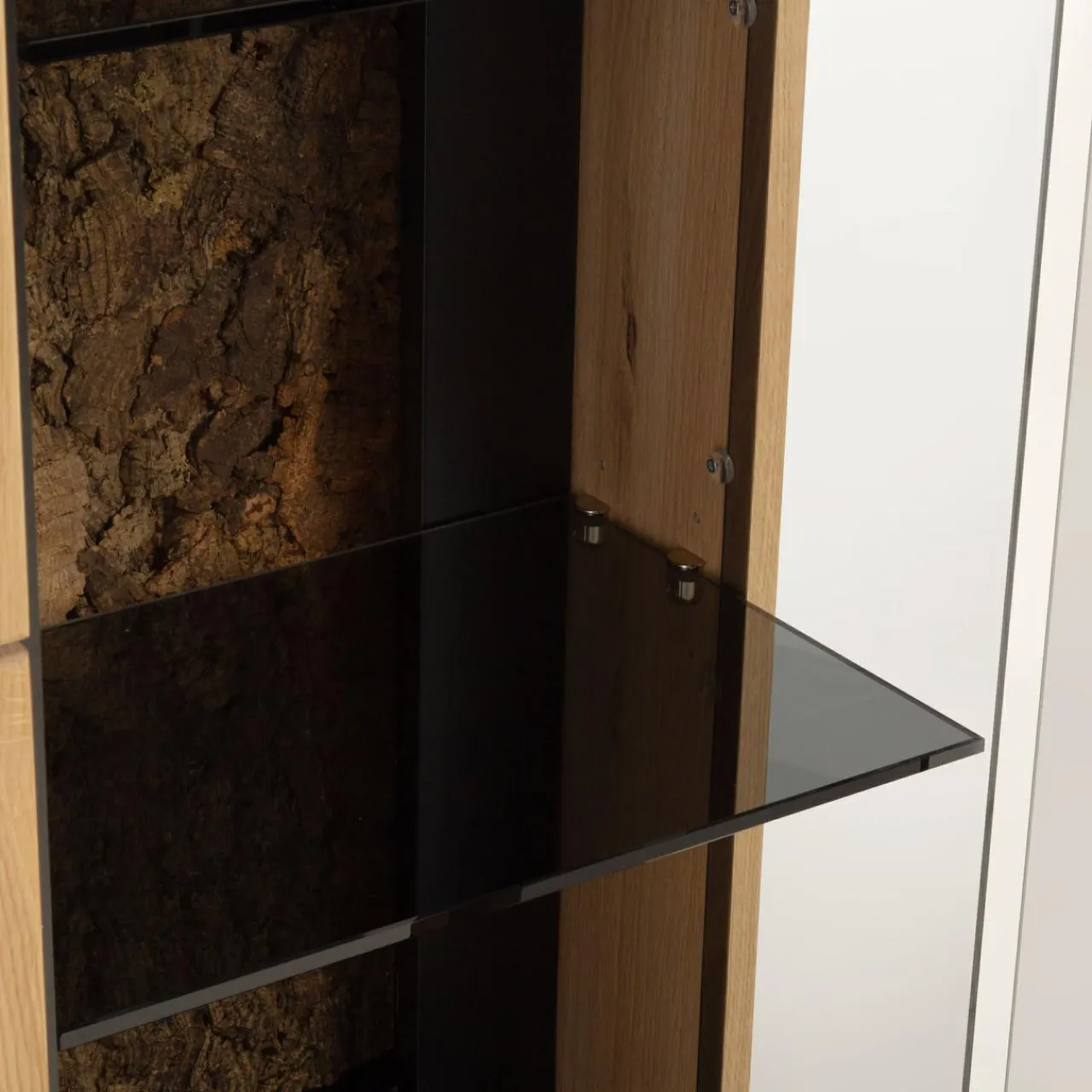 - Półki i witryny wykonane z ciemnego szkła podkreślają naturalne rysunki słojów i osadzoną w głębi korę.