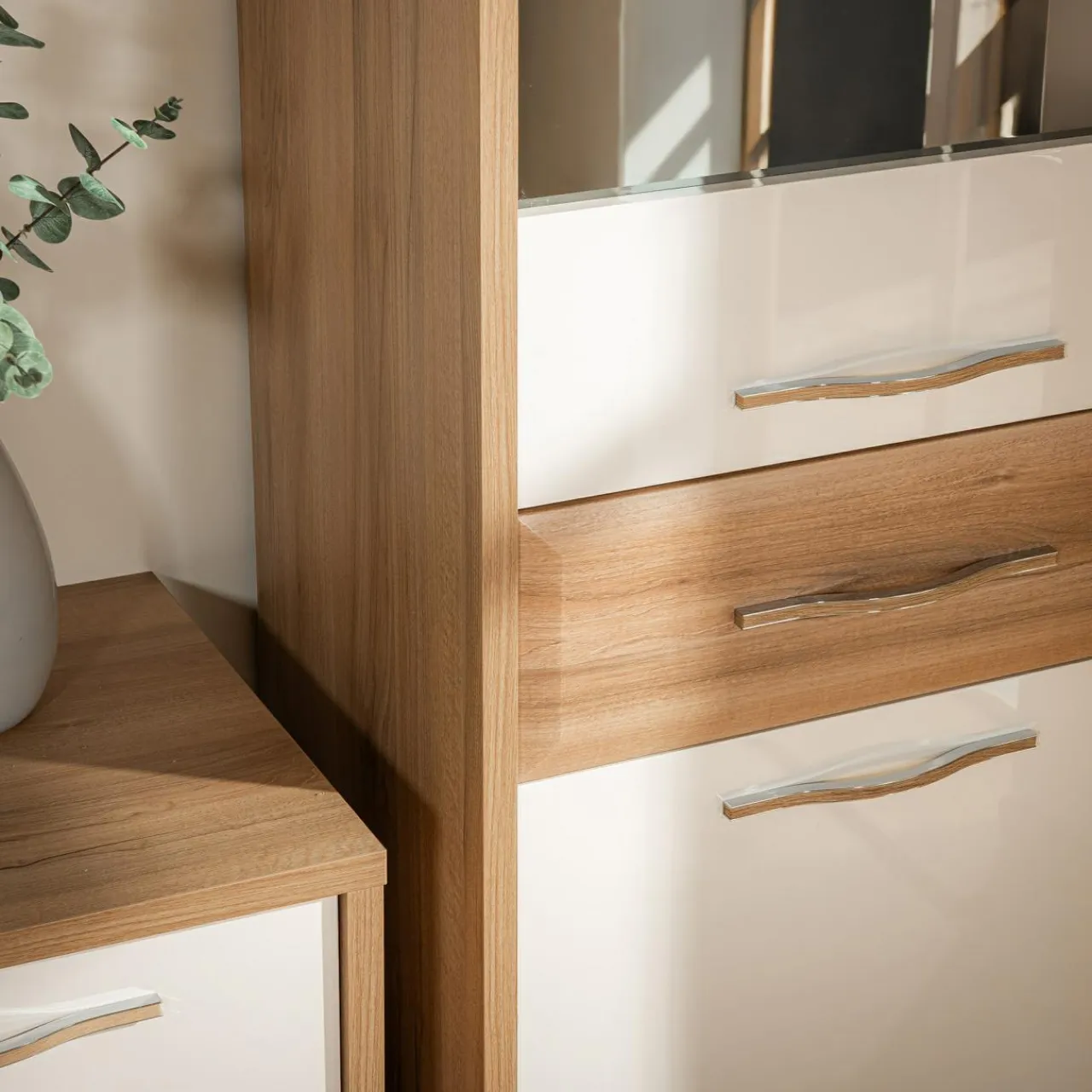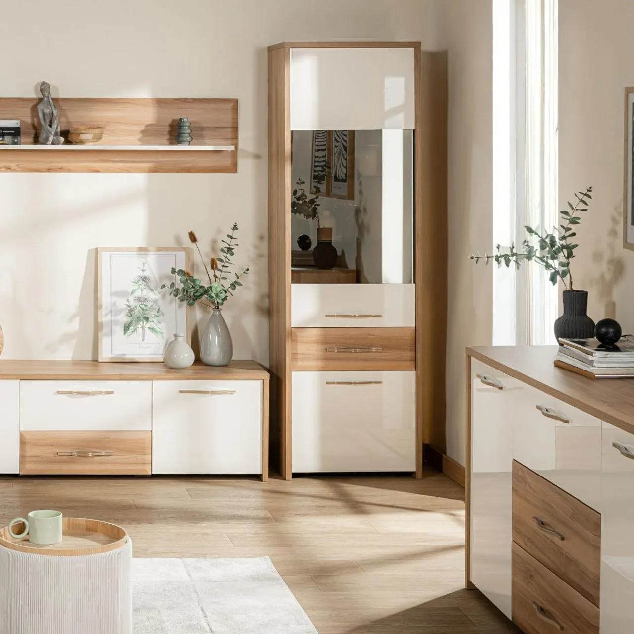 Kolekcja GALA łączy kolory jasnego drewna i beżu z wykończeniem na wysoki połysk, tworząc subtelną i elegancką atmosferę, idealnie pasującą do nowoczesnych czy minimalistycznych wnętrz. Dzięki tej kolekcji łatwo można zagospodarować przestrzeń, dodając dekoracje, które nadadzą jej unikalnego stylu. Szklane wazoniki, metaliczne ramki, stonowane tekstylia i rośliny to dodatki, które doskonale podkreślą nowoczesny charakter wnętrza, tworząc przytulną atmosferę sprzyjającą relaksowi i spotkaniom.