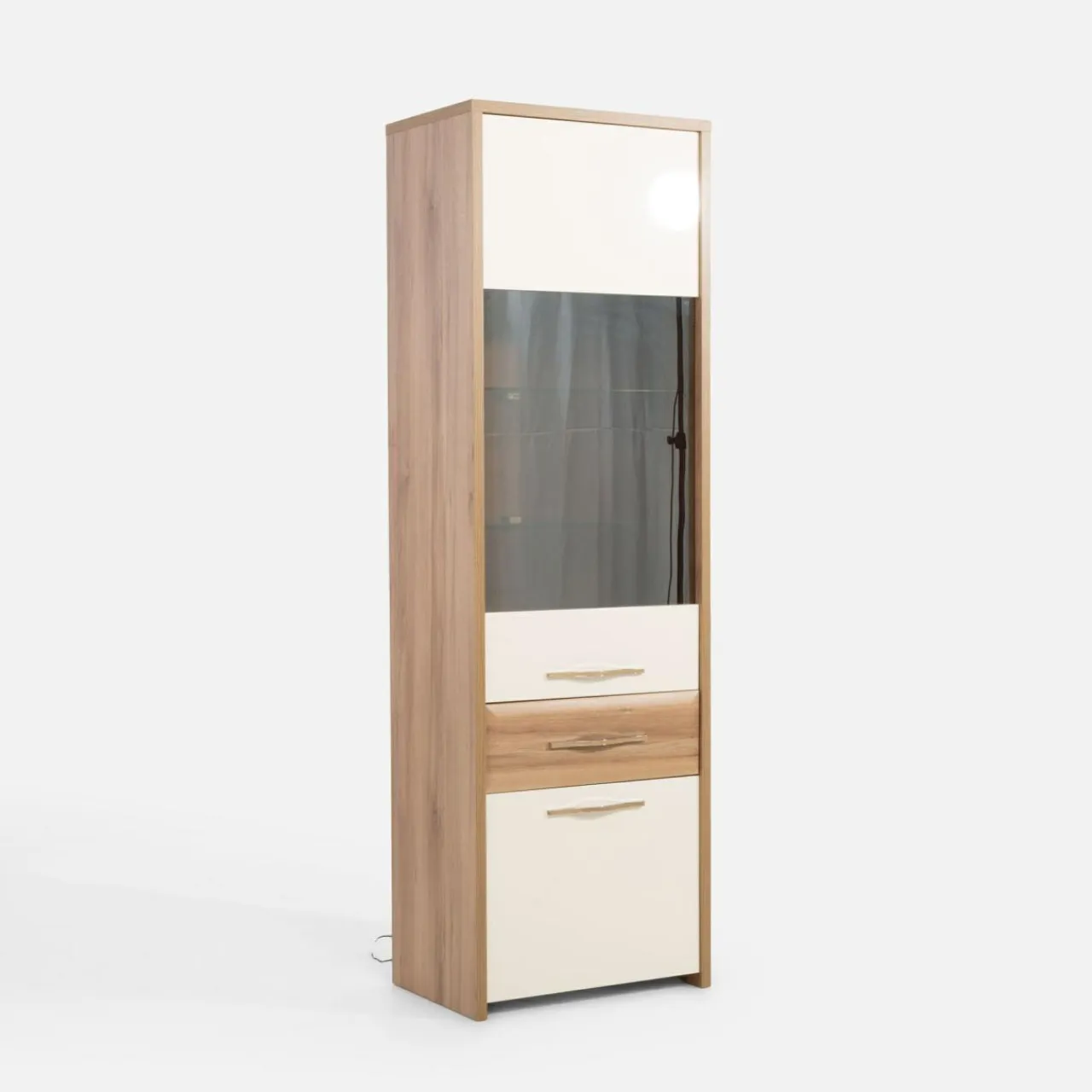 Witryna GALA to mebel, który wprowadzi nowoczesny styl do Twojego wnętrza. Połączenie dekoru drewna z beżowym wykończeniem na wysoki połysk nadaje jej wyjątkowego charakteru.