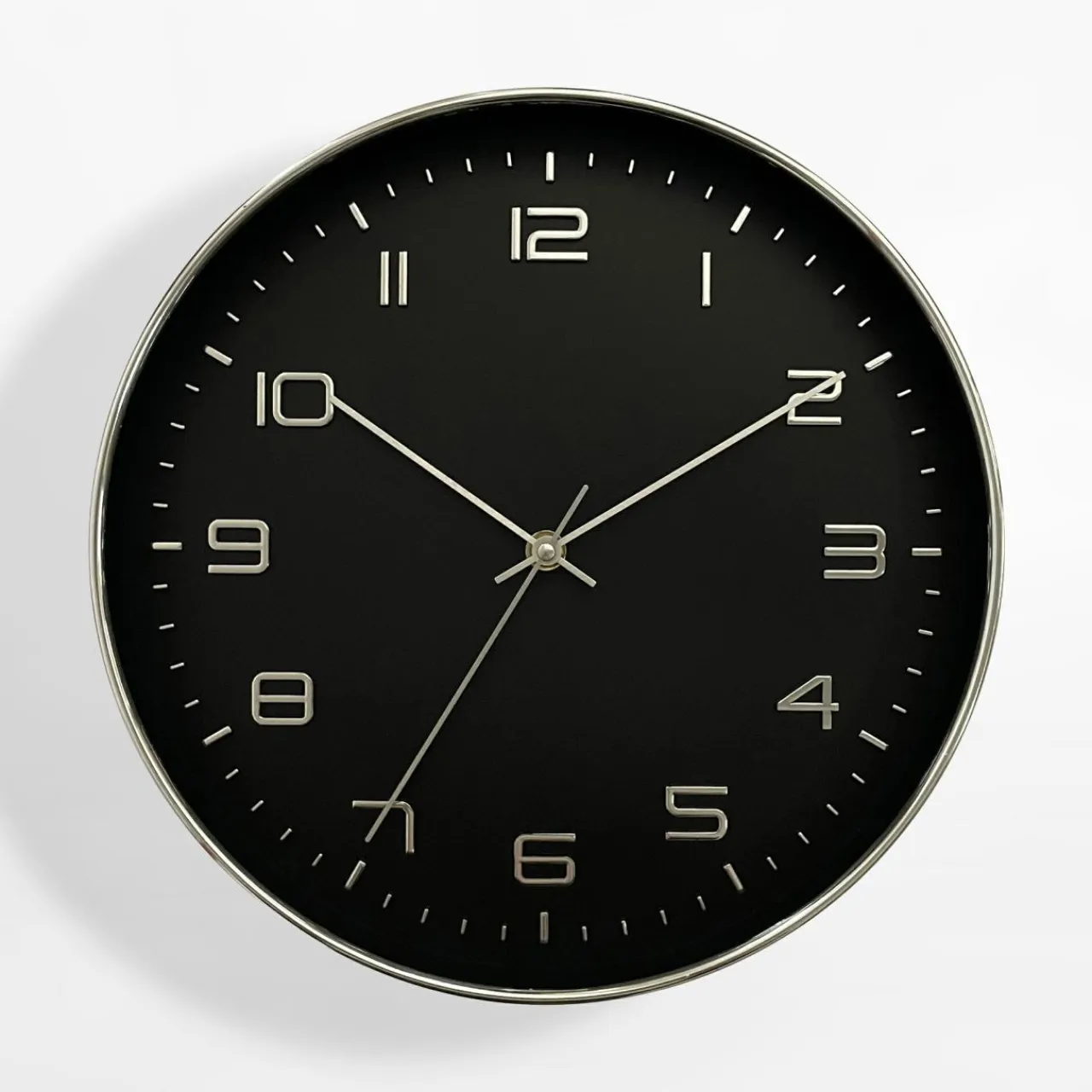 Okrągły czarno-srebrny zegar pokreśli nowoczesny wystrój kuchni lub salonu. Wyróżni się na tle jasnej ściany.