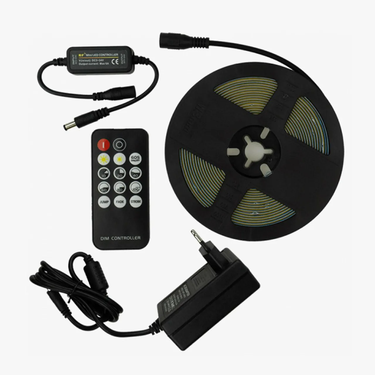 W skład niniejszego zestawu wchodzi taśma LED o długości 5m z pilotem i zasilaczem.