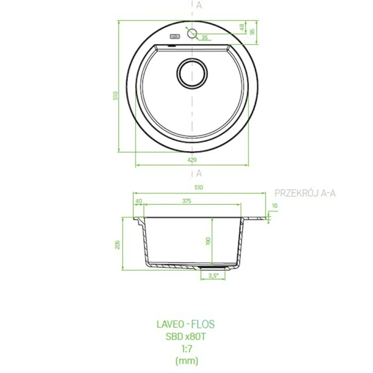 - Średnica odpływu: 3,5 cala