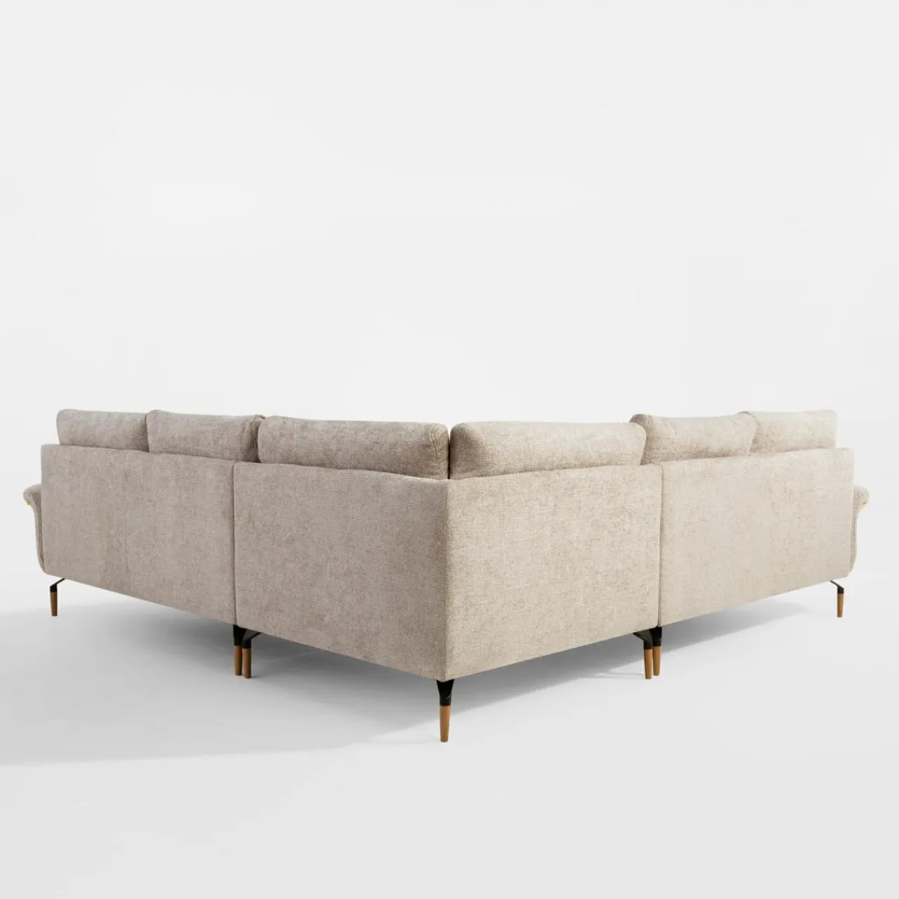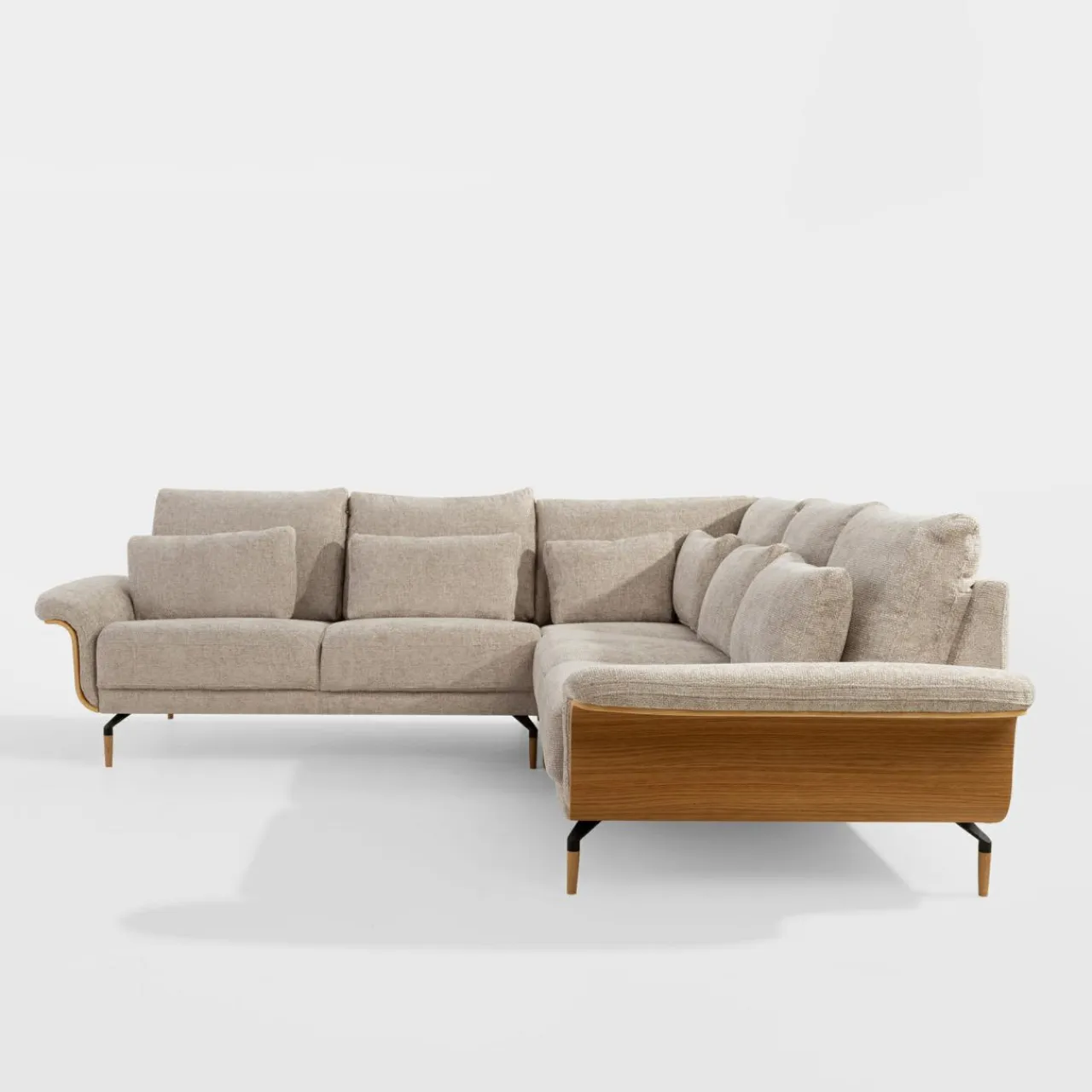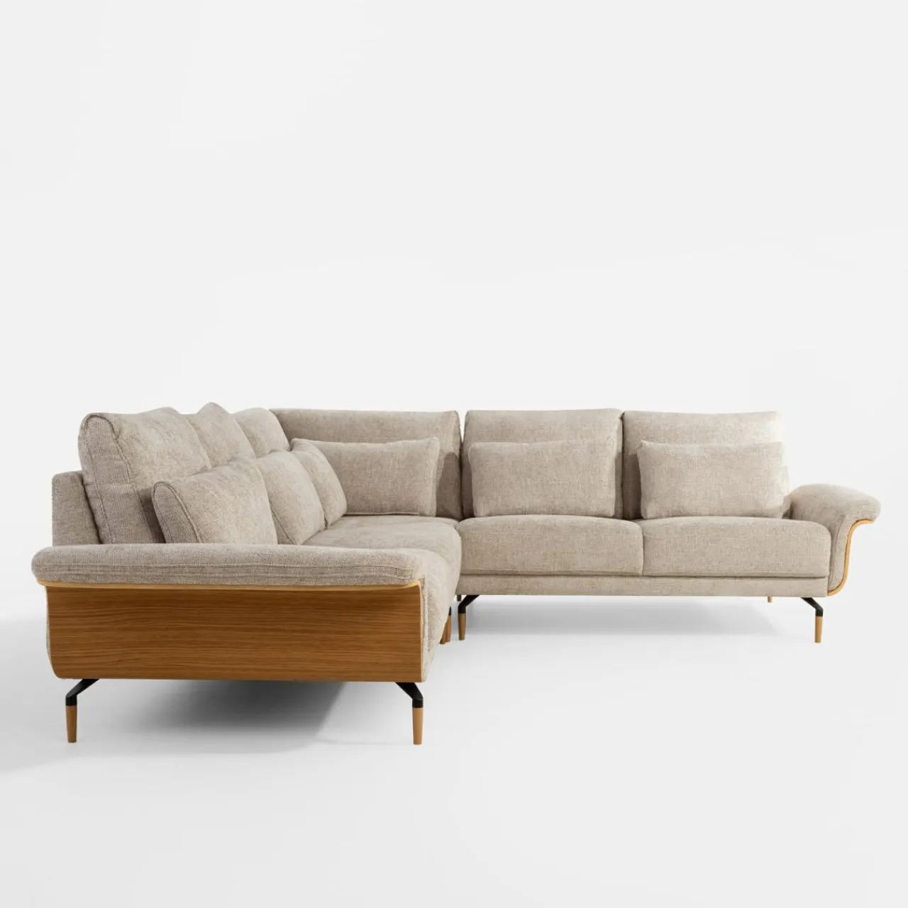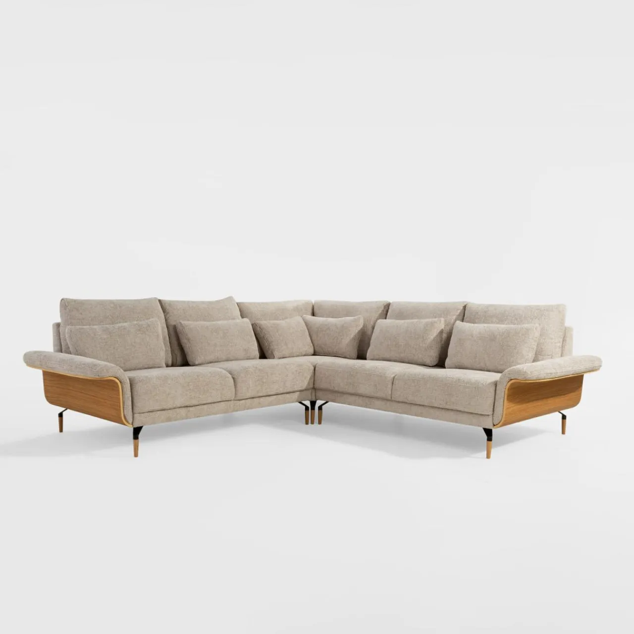 Narożnik RAMONA ma tapicerkę z miękkiego, modnego szenilu i boki w kolorze drewna. To dobry wybór do wnętrz w stylu skandynawskim i nowoczesnym.