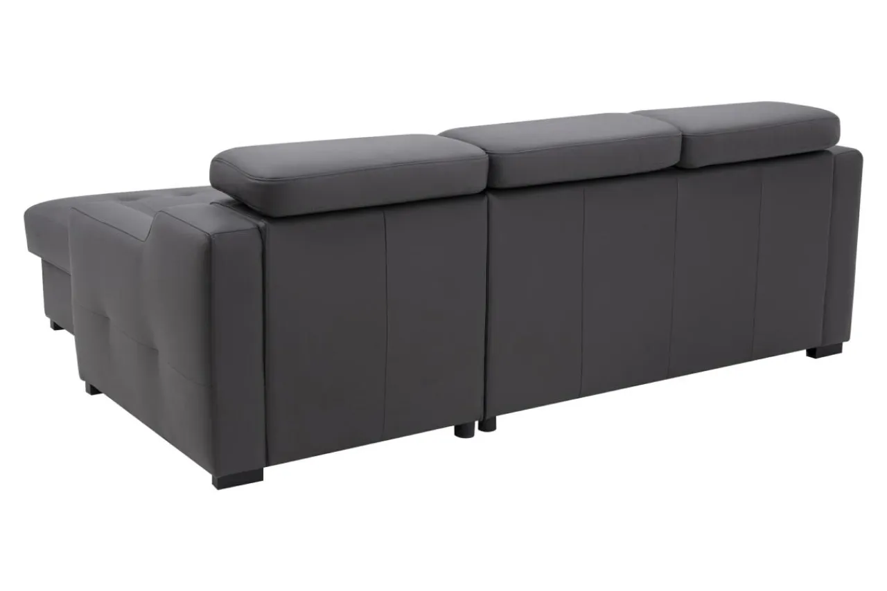 Narożnik posiada pikowane siedzisko. Pokryty jest skórą naturalną w grafitowym kolorze i wykończony ozdobnym przeszyciem. Całości dopełniają proste, solidne nóżki w czarnym kolorze.
